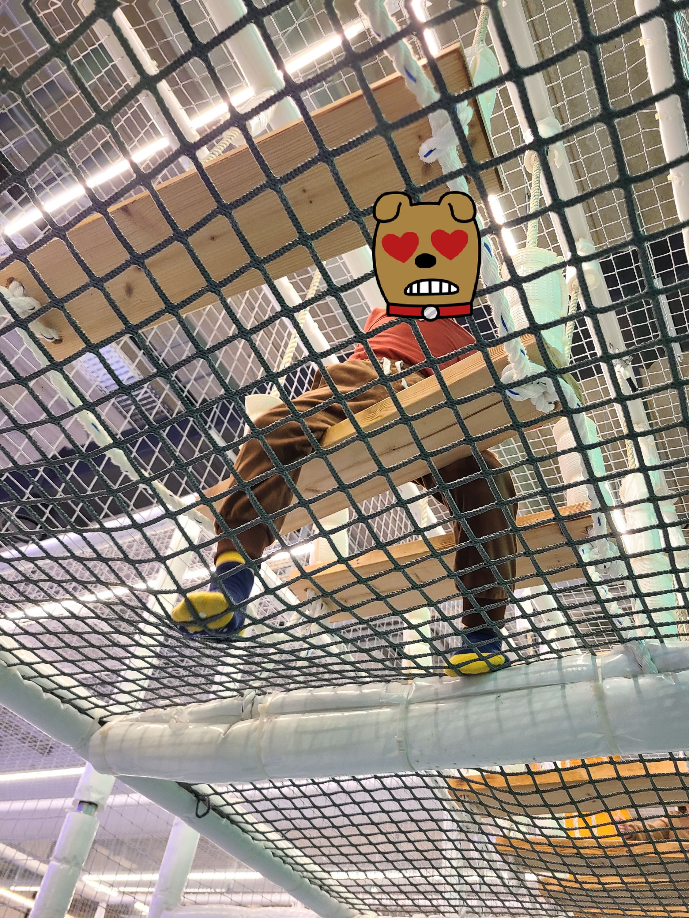 이건 정글짐처럼 이런 저런 기구를 통과하며 지나가는 길인데, 이 길의 끝에 만나는 미끄럼틀이 위의 볼풀장으로 연결되어 있습니다. 여기 올라가는 것도 무서워했었는데, 이젠 아무렇지 않게 올라가네요.
