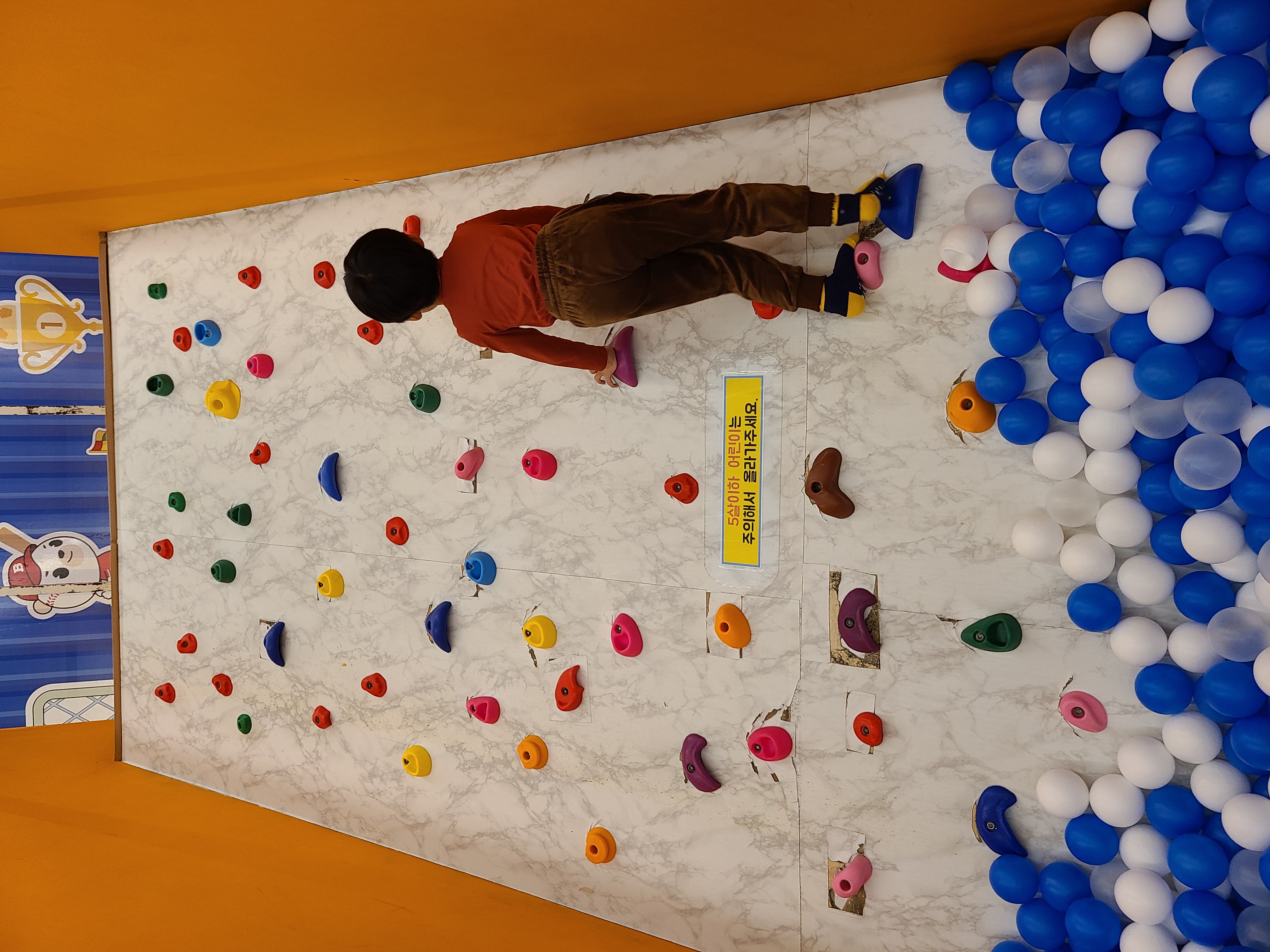 여긴 볼베어파크 기흥점을 입장하자마자 보이는 큰 볼풀장의 미끄럼틀입니다. 계단으로 올라가는 길도 있고, 이렇게 암벽등반(클라이밍)을 하며 올라가는 길도 있습니다. 여기로 올라가보겠다 시도해봅니다만,