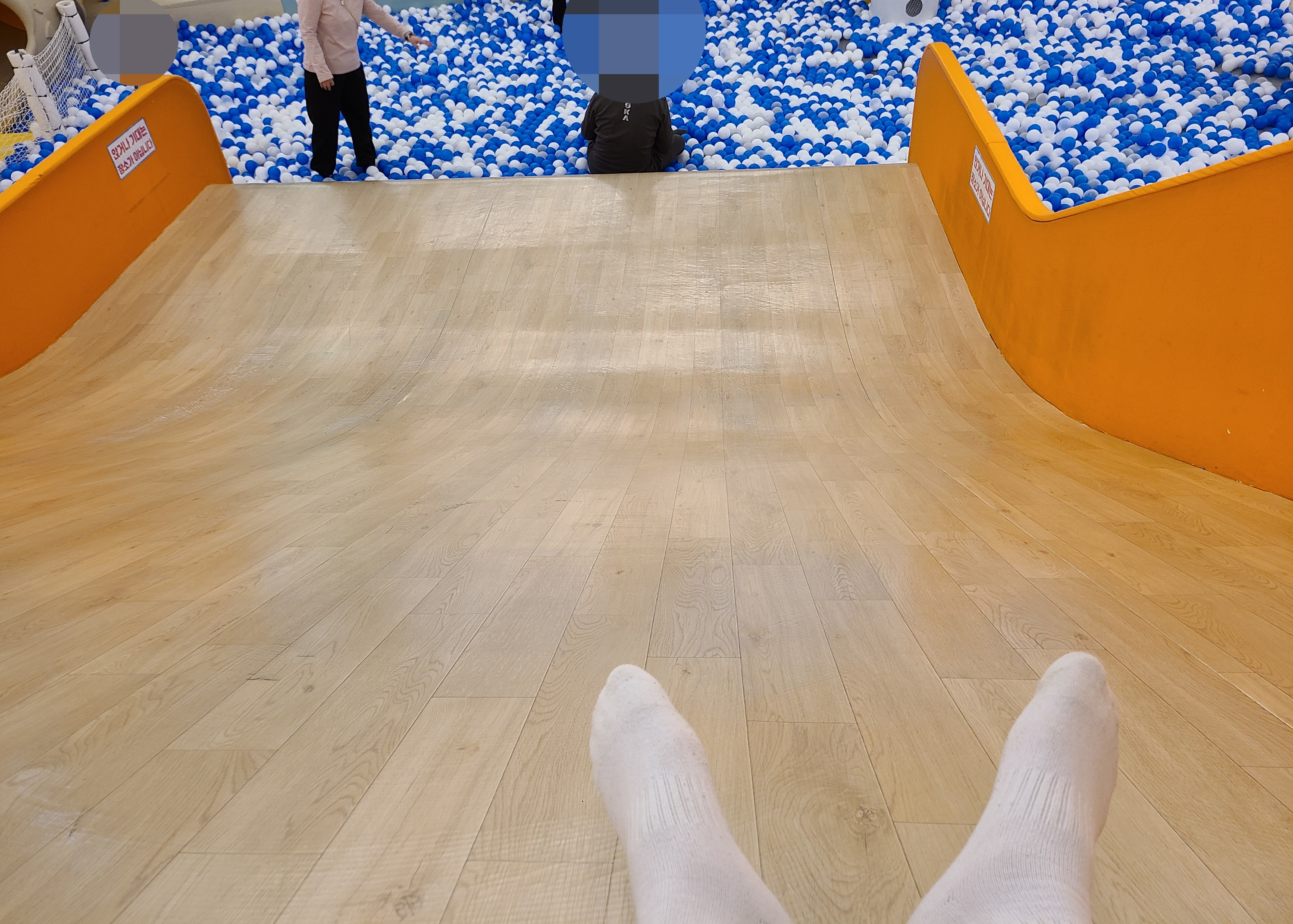 계단을 올라오면 미끄럼틀이 꽤 넓게 준비되어 있습니다. 4~5명 정도 동시에 내려갈 수 있었던 것 같고, 미끄러워서 속도감도 있습니다.