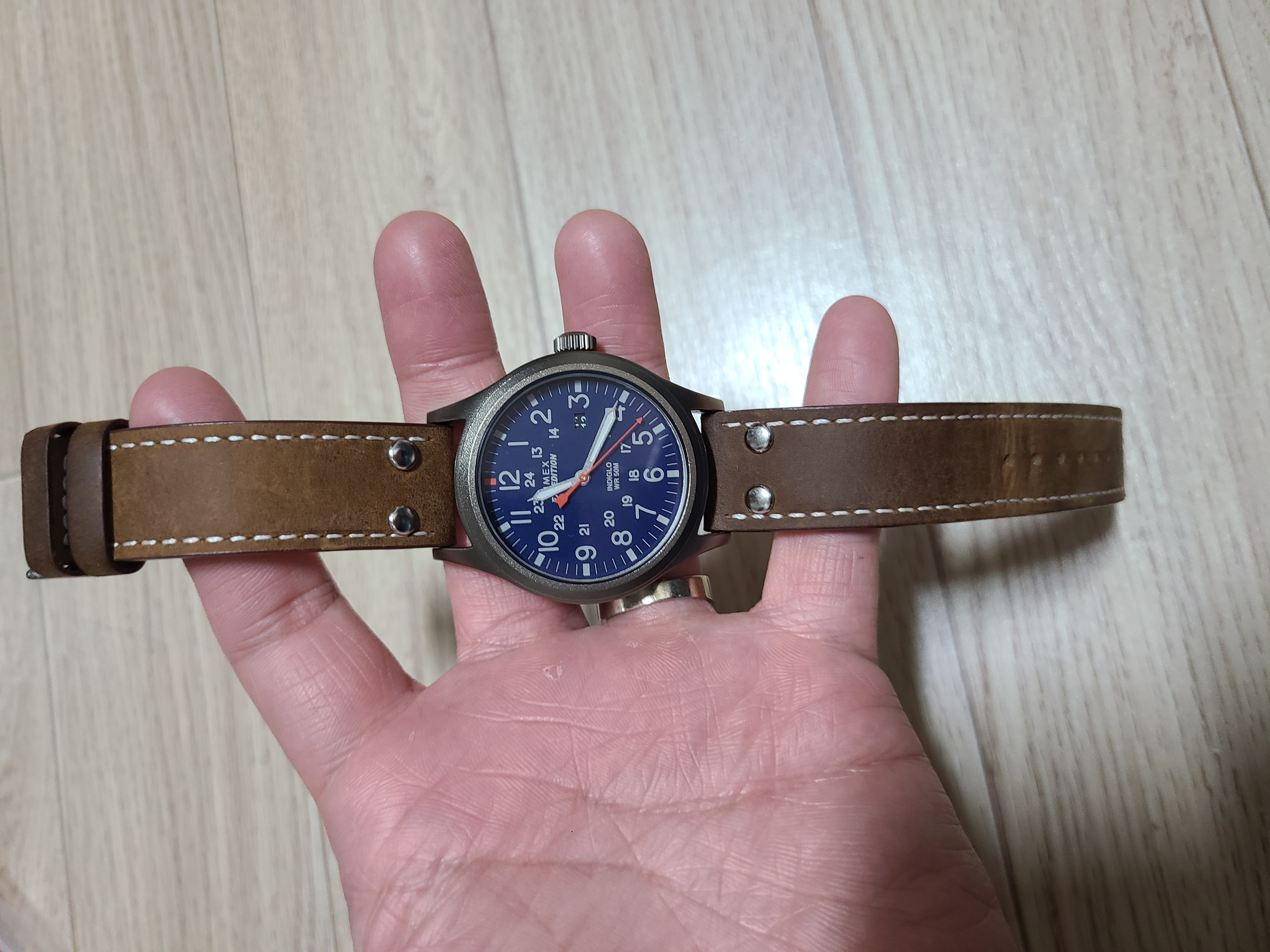 역시 톤다운된 시계줄로 바꿔주니 잘 어울립니다. 리벳 스트랩이 파일럿 워치(플리거)에만 잘 어울릴거라 생각했는데, 이런 필드워치 디자인에도 잘 어울리네요. 타이맥스 익스페디션 스카우트의 황동 케이스가 어두운 색감이라, 지금 이 시계줄처럼 진한색이 잘 어울리는 것 같습니다.