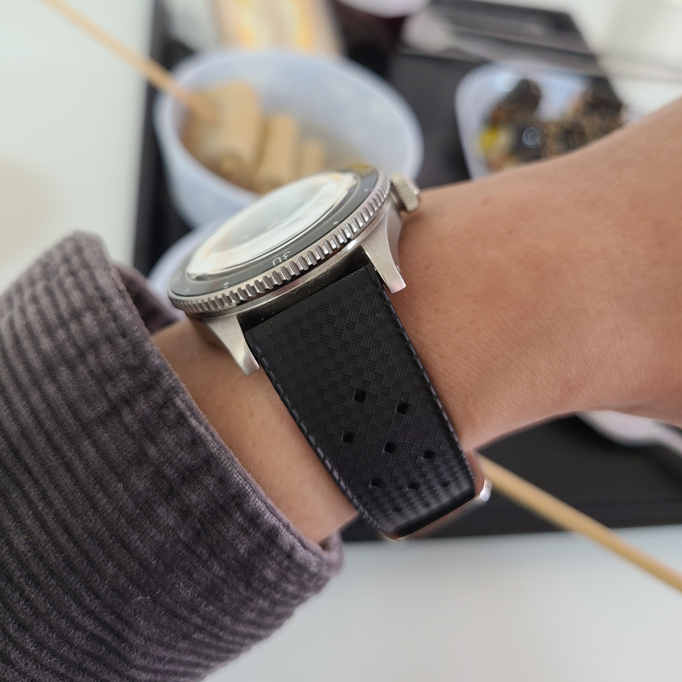 검은색의 트로픽 러버 스트랩을 체결해주니 한결 차분해진 모습입니다. 발틱 아쿠아스카프가 워낙 곱상한 이미지를 가지고 있어서 다이버워치임에도 드레시한 분위기를 만들어내기까지 하는 손목시계인 것 같습니다.