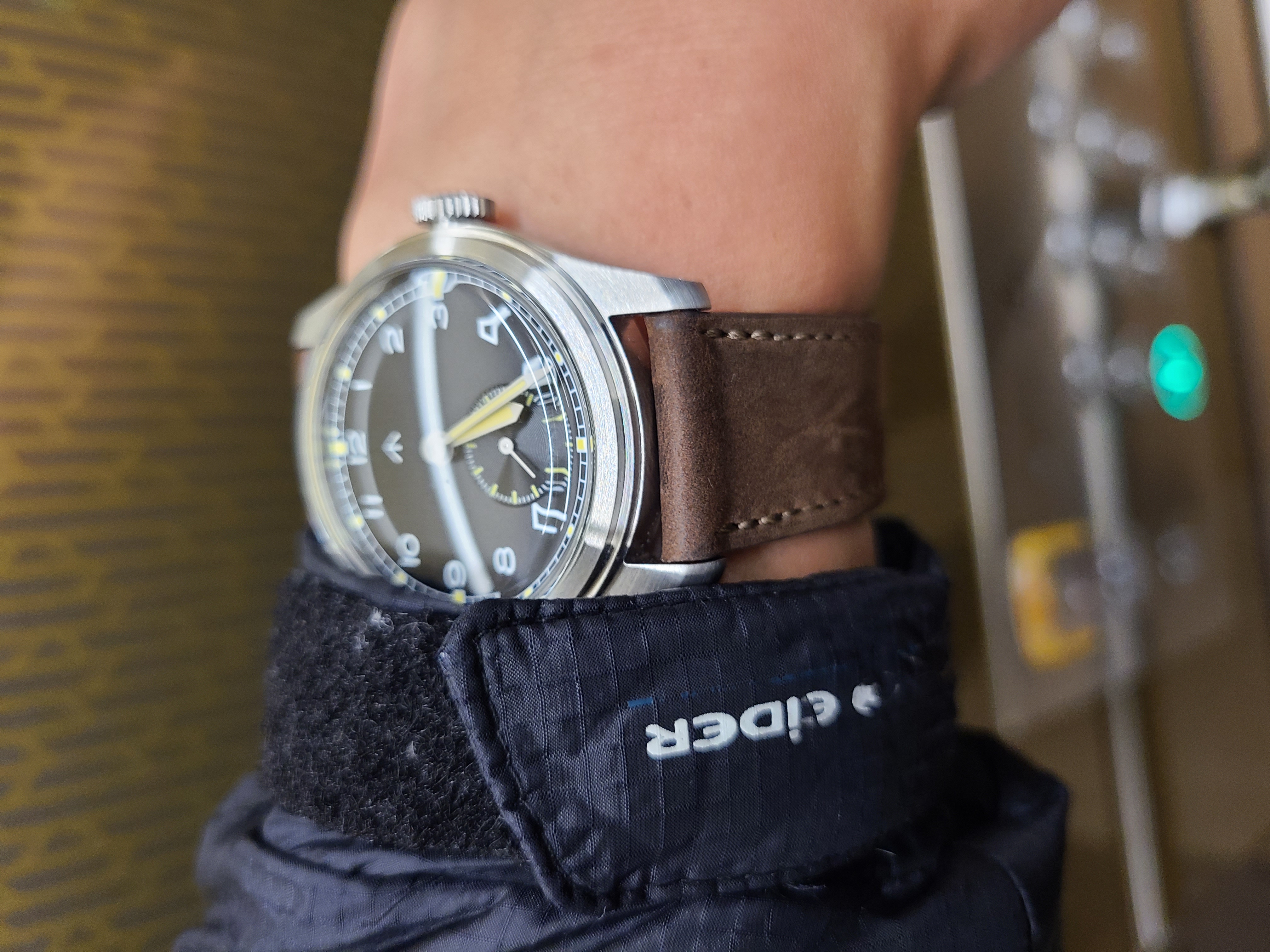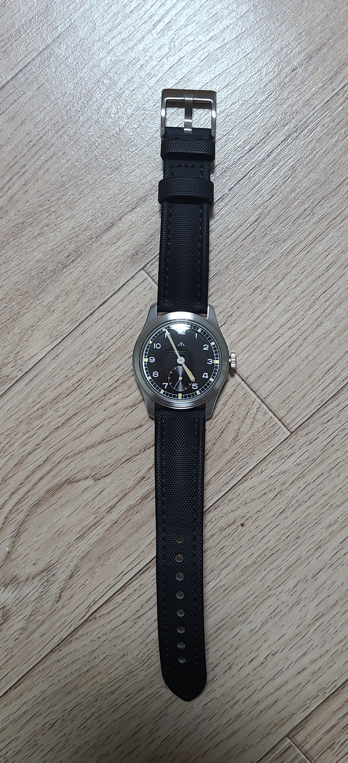 시계줄을 뚝딱 바꿔준 후, 멀리서 사진을 찍어봤습니다. 이 메르커 세이젠 더티더즌은 밀리타도 더티더즌 이후 두 번째 더티더즌인데, 이 디자인은 볼 때마다 꽤나 드레시하다는 느낌을 받습니다. 군용 시계 디자인의 손목시계이지만 다이얼(시계판)이 군더더기 없이 깔끔하고 정갈해서 그런 것 같습니다. 그래서 이렇게 드레시한 플루코 마운틴베어 스트랩을 매치해주어도 잘 어울리는 것 같다 느낍니다.