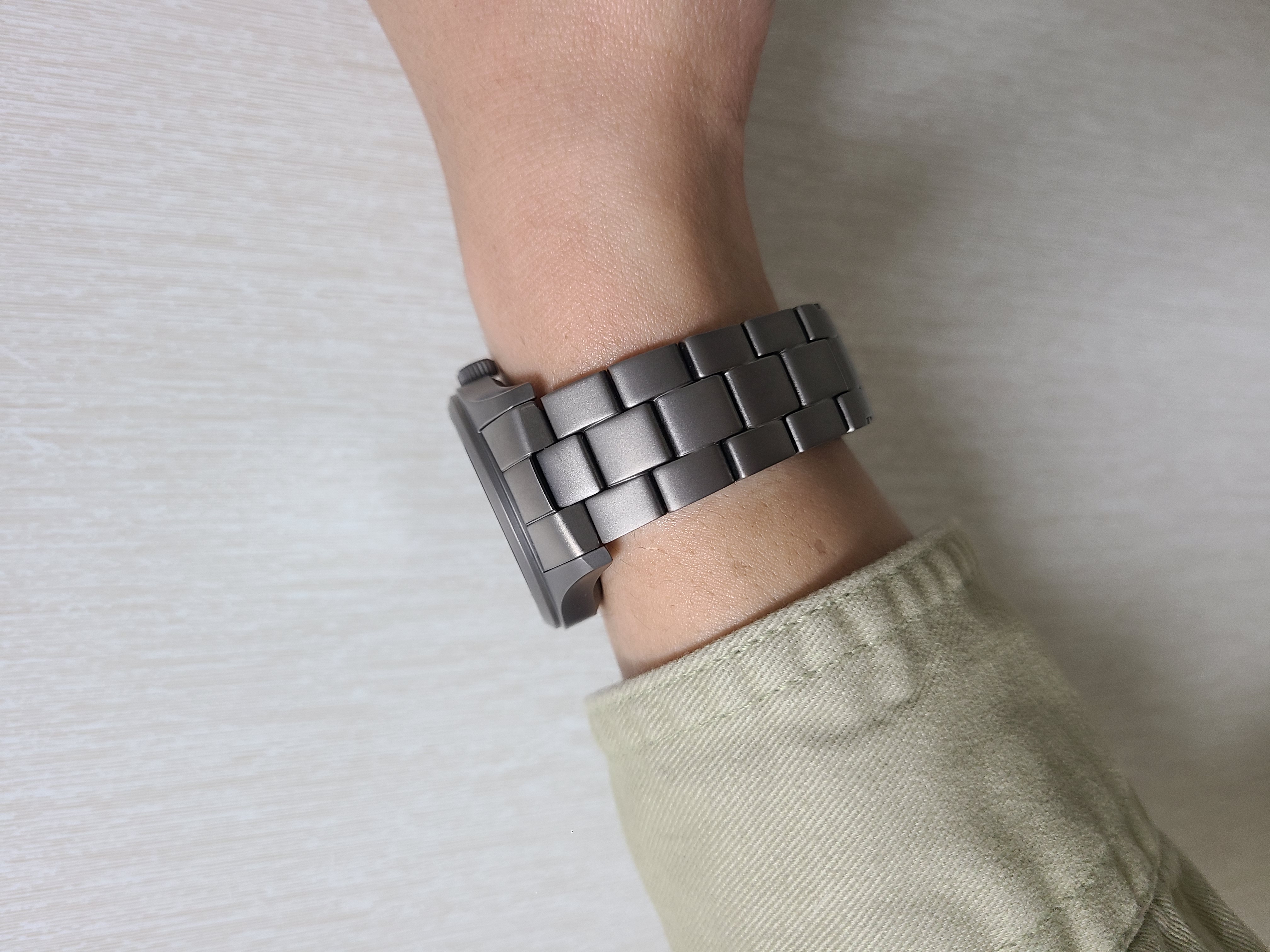 브레이슬릿과 시계 케이스는 전반적으로 일반적인 스테인리스 스틸의 색감보다 조금 어두운데, 이는 건메탈 코팅이 되어있기 때문이라고 합니다. 또, 버클은 양쪽에서 눌러 풀어내는 방식인데, 동작이 부드러워서 사용할 때 불편한 점은 없었습니다.