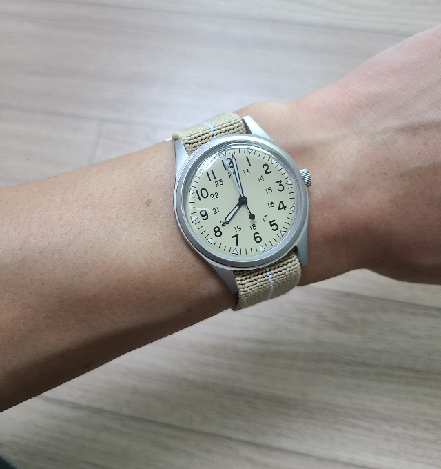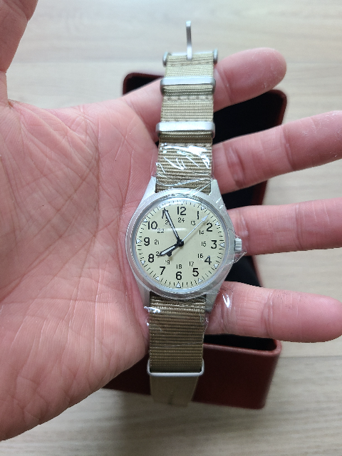 크림색 다이얼이 카키색 나토 스트랩과 아주 찰떡같이 잘 어울리는 것 같습니다. 색감이 정말 마음에 드는군요. 비닐을 당장에 벗겨주었습니다.