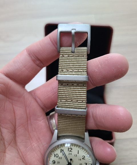 기존의 시계줄보다는 약간 더 밝은 모래색의 MN 낙하산 나토밴드 스트랩인데, J.P.D. Works 라는 곳에서 구입한 제품입니다. 밀리타도 ML07이 오면 끼워주려고 미리 준비하고 있었습니다. 역시 비슷한 색이라 잘 어울리고, 전체적으로 카키색이라 흔하지 않으면서도 무난한 것 같습니다.