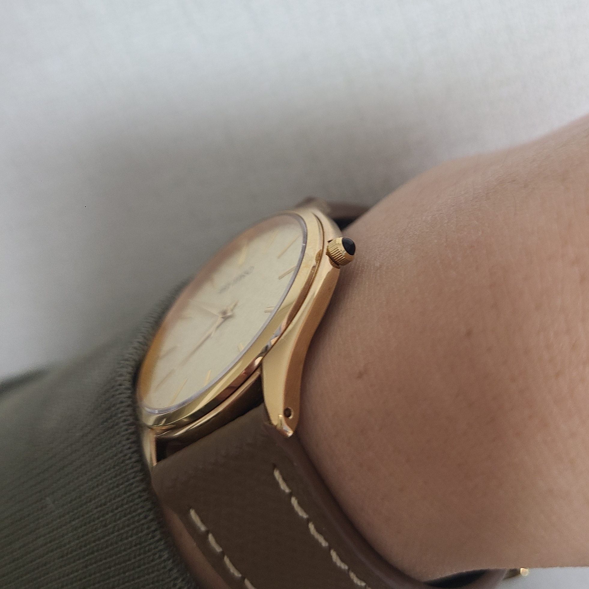 금빛 케이스에 금빛 핸즈, 금빛 인덱스에 금빛 다이얼까지, 모든 요소가 금빛으로 통일되어 있어서 화려하지만 또 단정해보이기도 합니다. 시계판(다이얼)이 흰색이었다면 금빛이 이렇게 은은하지 않았을 것 같습니다.