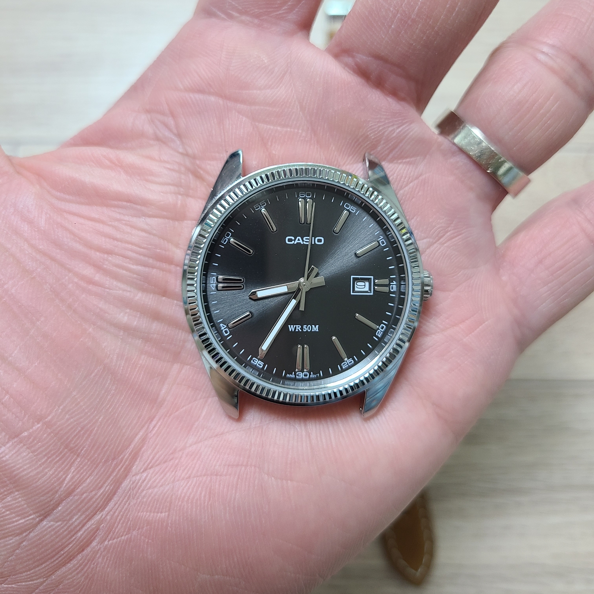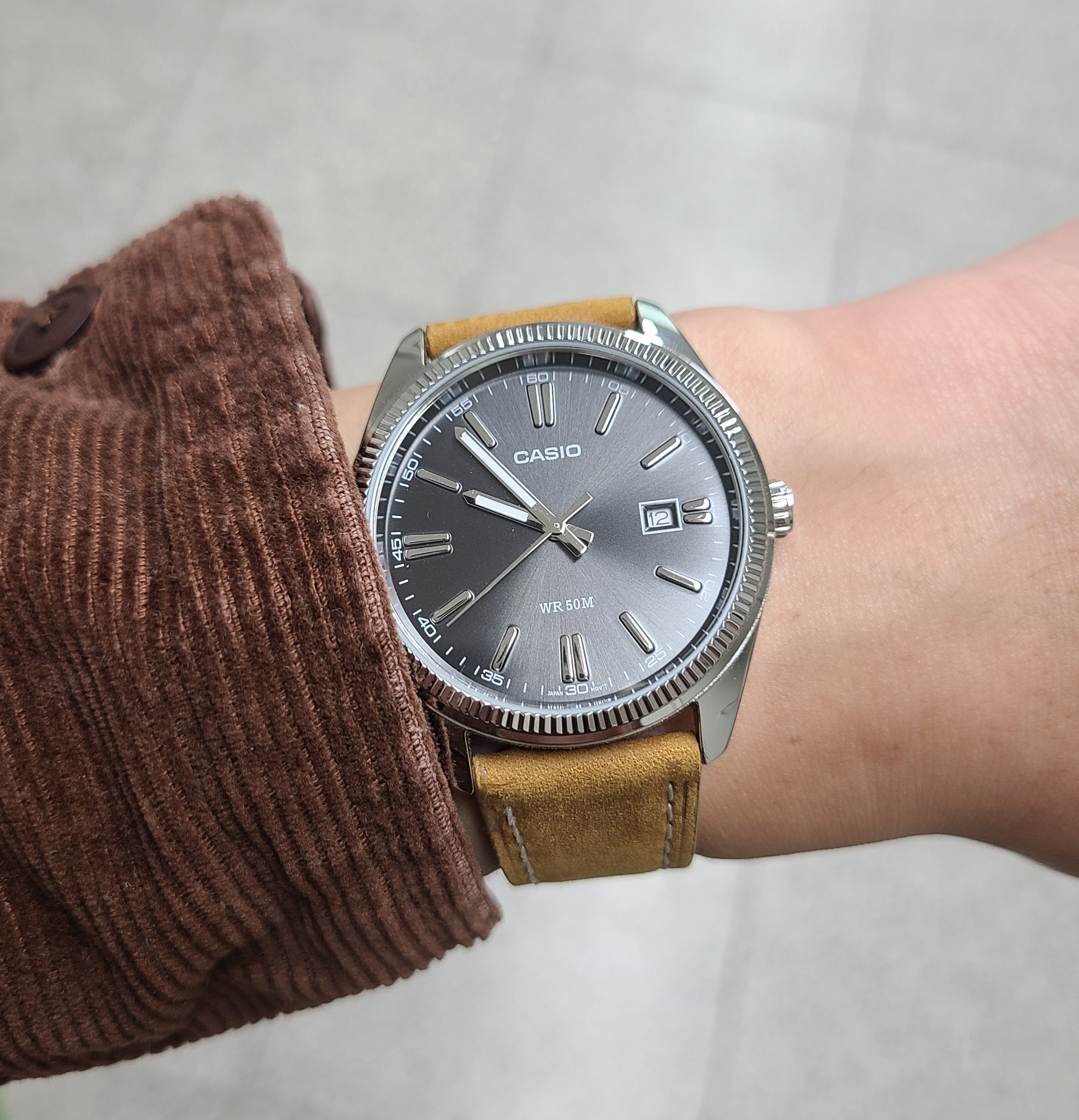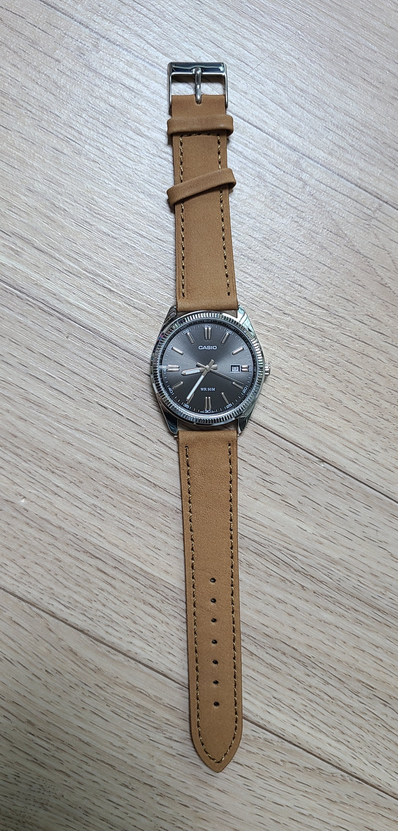 그럼 새 시계줄을 사용해봐야겠죠. 이번에 꺼내온 손목시계는 유명한 카시오시계이자 카이저스트라는 별명을 가지고 있는 MTP-1302 모델입니다. 검은색 선레이 다이얼과 플루티드 베젤(코인 베젤)의 반짝임이 매력적인 손목시계이지요.