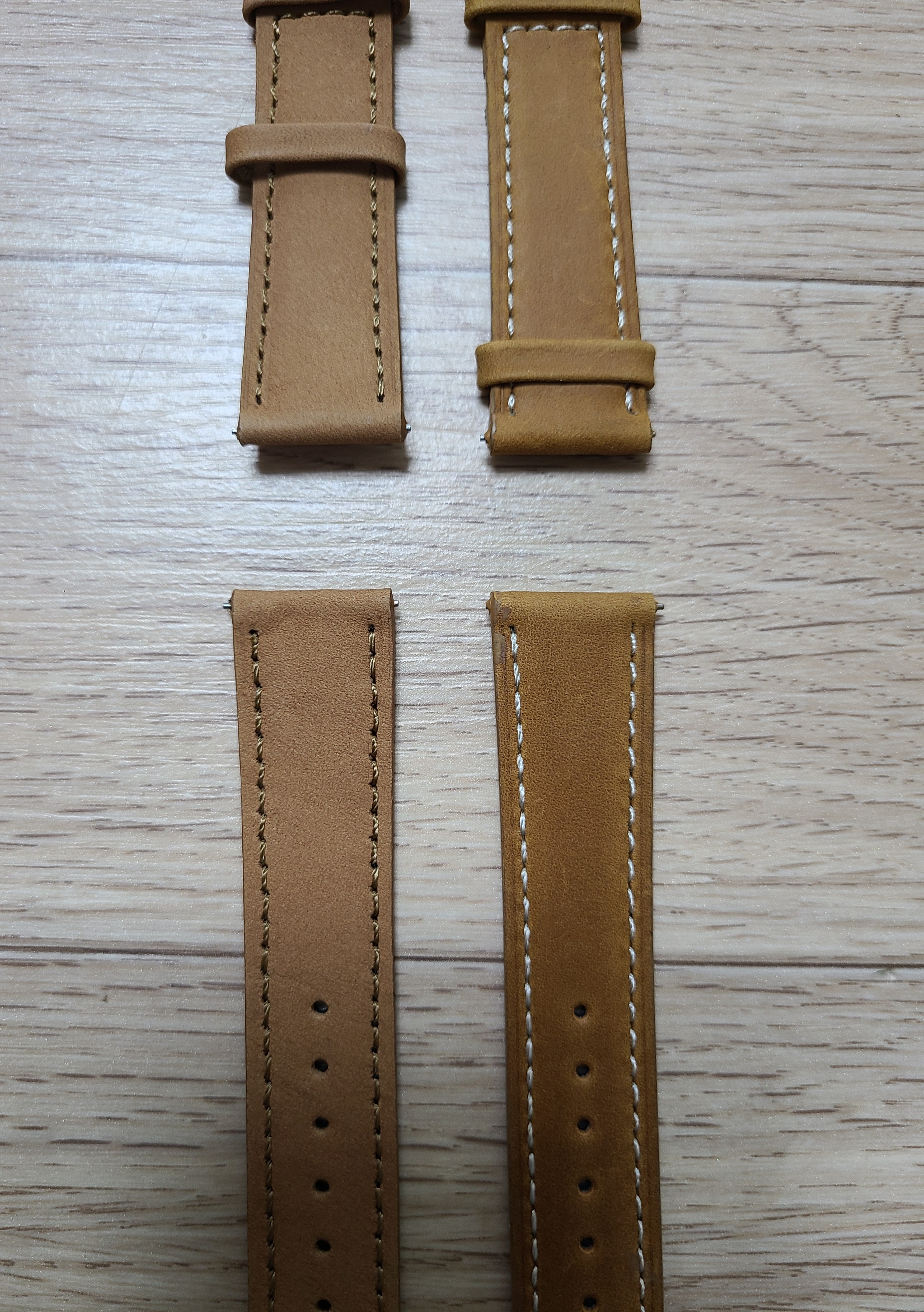 두 시계줄을 나란히 놓고 비교해보면 갈색(Brown)이 조금 더 파스텔 톤에 가까운 색으로 보이고, 탠(Tan) 색은 더 진하고 선명한 갈색으로 보이는 것 같습니다.