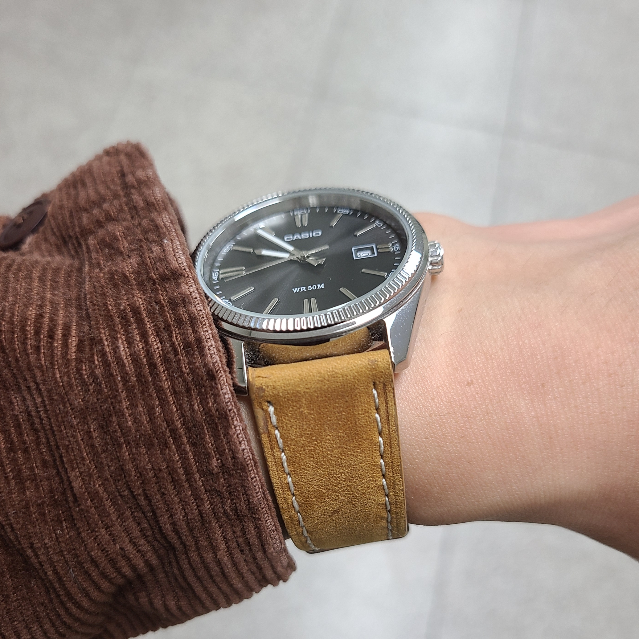 슬쩍 손목을 돌려보면 이런 느낌입니다. 매트한 느낌의 갈색 시계줄이 검판 카이저스트와 잘 어울리는 것 같네요.