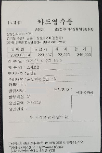 보험에 가입되어 있다는 말씀을 드렸더니 수리가 끝나고 스마트폰을 전해받을 때 보험 청구에 필요한 일체의 서류들을 함께 챙겨주셨습니다.