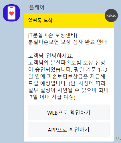 보상 접수를 완료하면 정상적으로 접수가 되었고 서류를 심사중이라는 안내 카톡이 옵니다.