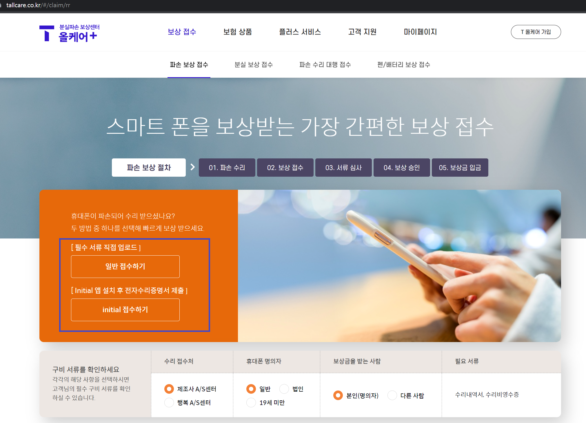 보상 접수를 누르시면 아래의 화면으로 넘어갑니다.