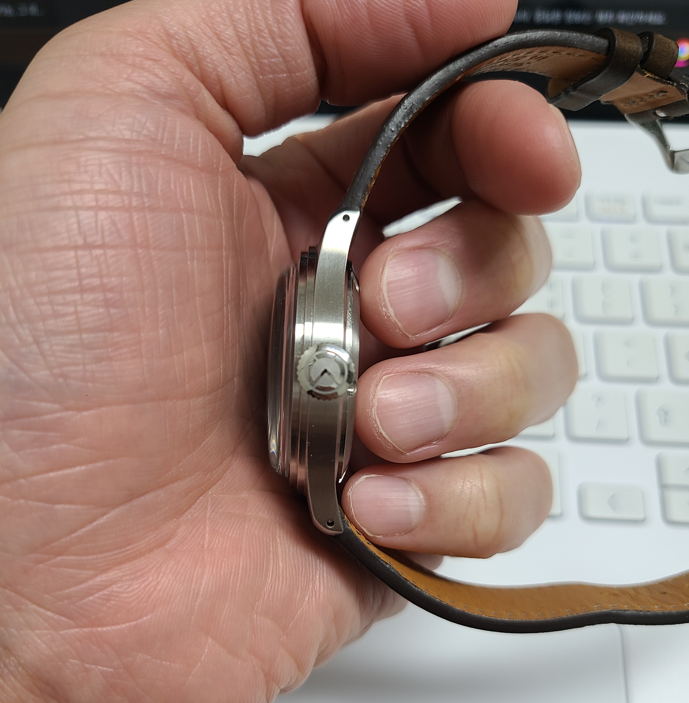 돔형 글라스가 뚝 떨어지고 나면 그 다음 계단식 베젤이 차례로 내려오는 느낌입니다. 무브먼트 정보도 없는 불안한 손목시계이지만, 디자인이나 크기가 마음에 들어서 잘 사용하고 있습니다. 무엇보다도 제대로 복각한 더티더즌의 가격에 비하면 굉장히 저렴한 편이라서 이런저런 고민은 접어두고 즐기려고 합니다.