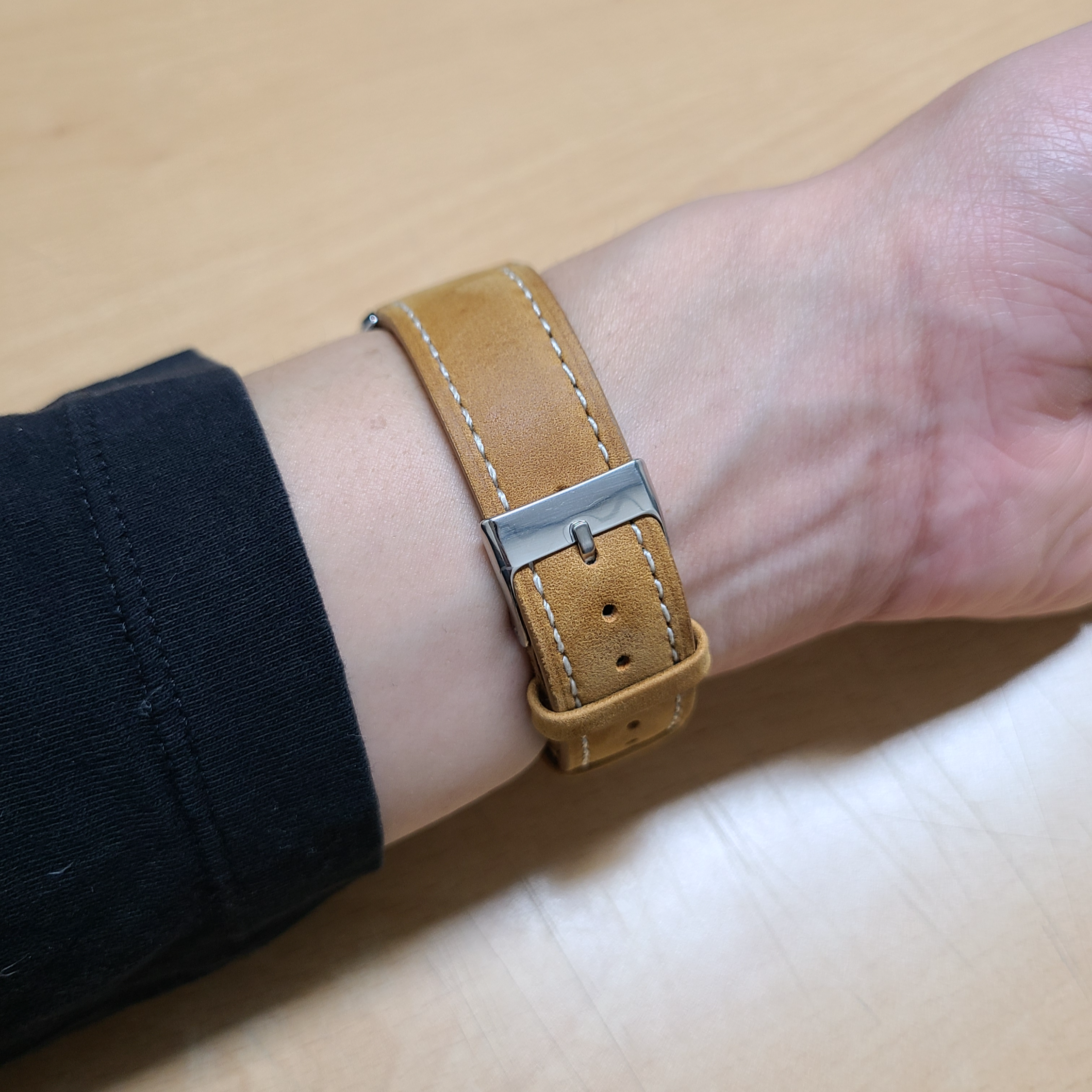 시계줄의 선명한 색과 함께 흰색으로 스티치가 들어간 부분도, 표면의 광택이 없는 매트한 느낌이라는 점도 캐주얼함을 더해주는 요소인 것 같습니다. 탠(Tan) 색이 불에 그을린 듯한 가죽 색이라고 하는데, 색감이 참 좋은 것 같습니다.