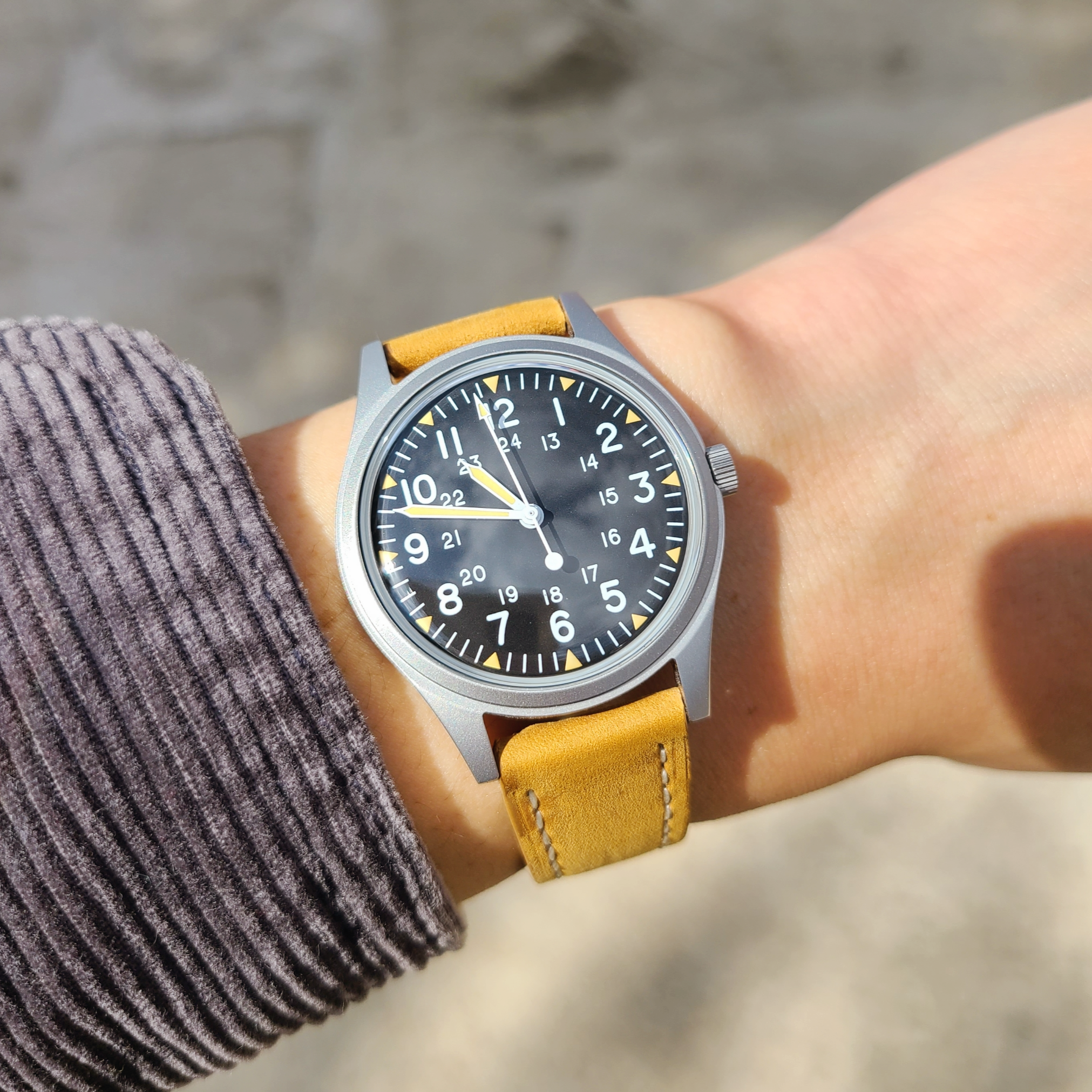 밀리타도 하면 빼놓을 수 없는 손목시계, 더티더즌입니다. 더티더즌을 좋은 비율로 복각해냈고 36mm의 케이스 사이즈라 작은 시계를 선호하시는 분들께 매력적인 손목시계입니다.