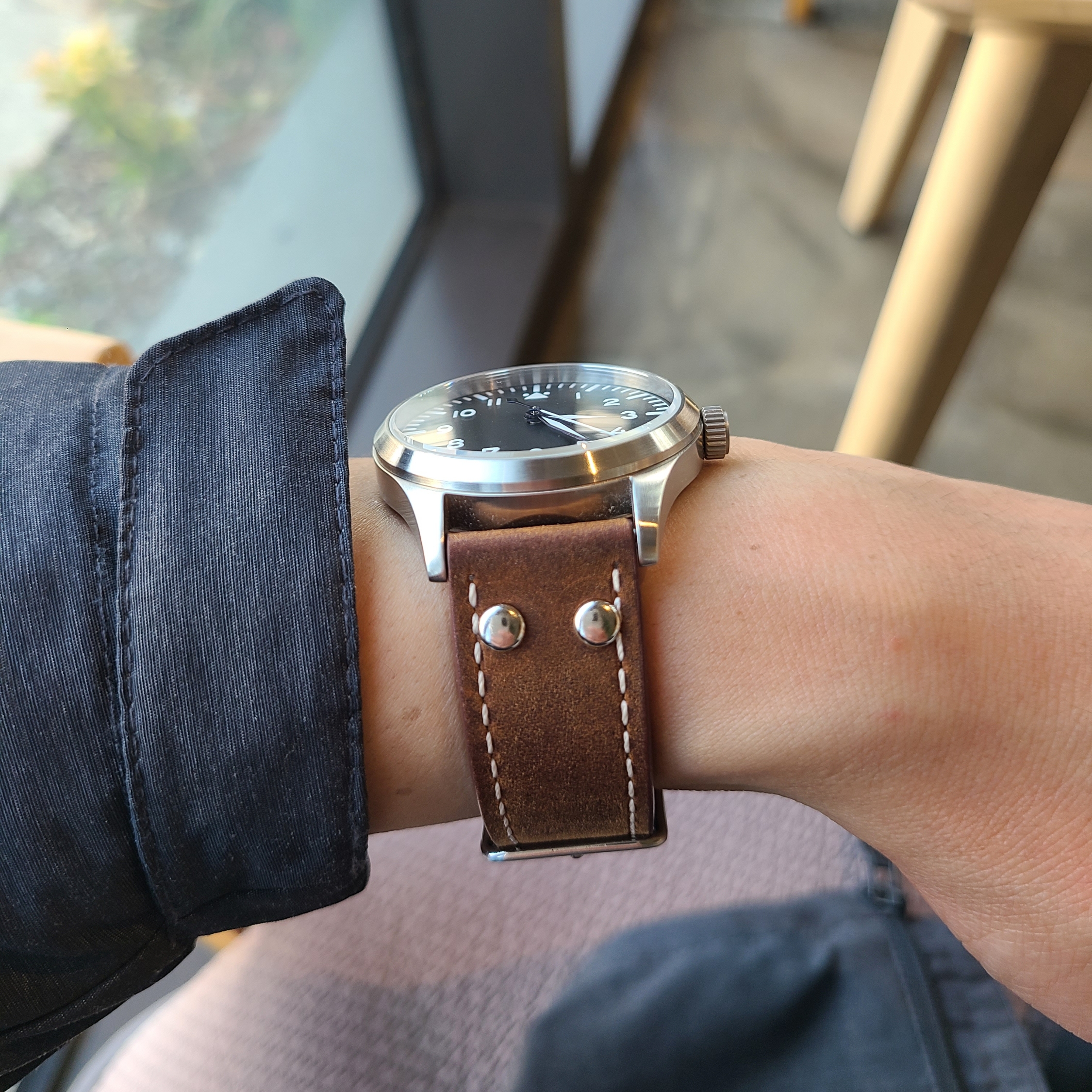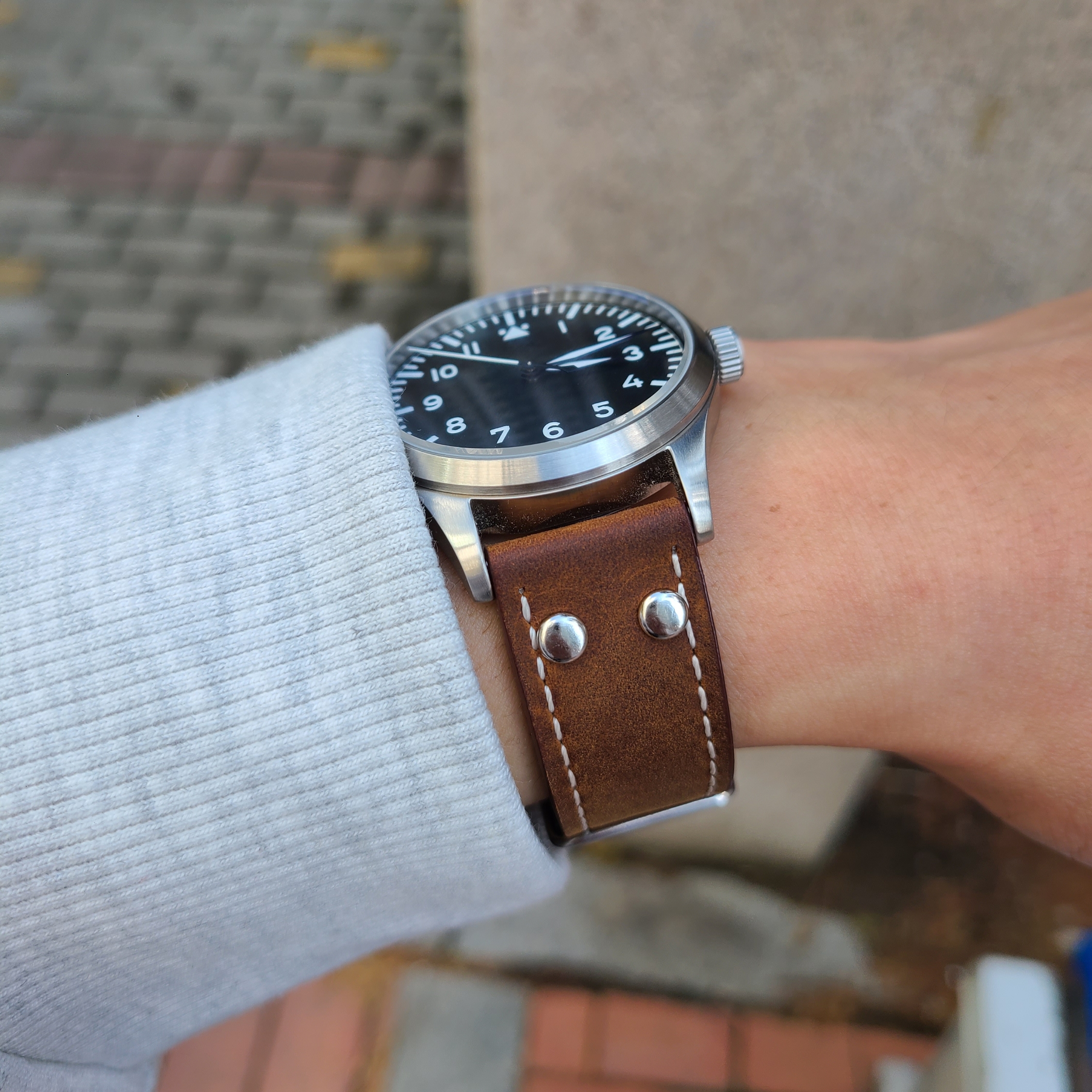 파일럿 워치에는 역시 리벳 스트랩이지, 하는 생각으로 알리에서 구입한 시계줄을 사용하고 있습니다. 두툼한 시계줄에 리벳까지 박혀있으니 파일럿 워치의 감성이 느껴지는 것 같습니다...만, 시계줄이 두꺼워지면 착용감은 그에 반비례하여 떨어지는 것 같습니다. 너무 두툼한 시계줄이 조금은 버겁게 느껴지기 시작했습니다.