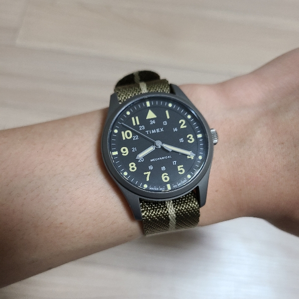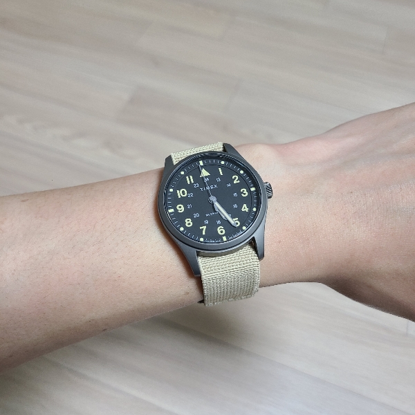 손목 아래에도 걸리적거리는 부분 없이 깔끔하게 밴드가 지나갑니다. 착용감 좋고, 색감도 좋은데, 뭔가 타이맥스 익스페디션의 터프하고 거친 느낌을 잘 표현하지는 못하는 것 같습니다. 툴워치, 필드워치 다운 모습이었으면 좋겠습니다.
