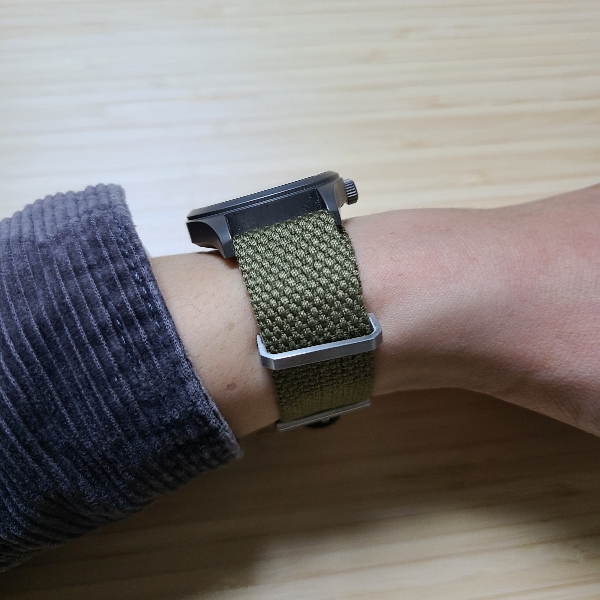 이 시계줄은 나토 스트랩 특유의 벌키한 느낌은 살리면서 편안한 착용감을 제공합니다. 보통 시계줄이 어떤 방식으로든 두꺼워지면 갑갑하고 불편해지기 마련인데, 면(캔버스) 소재를 활용한 덕에 이런 불편이 훨씬 덜해졌습니다.
