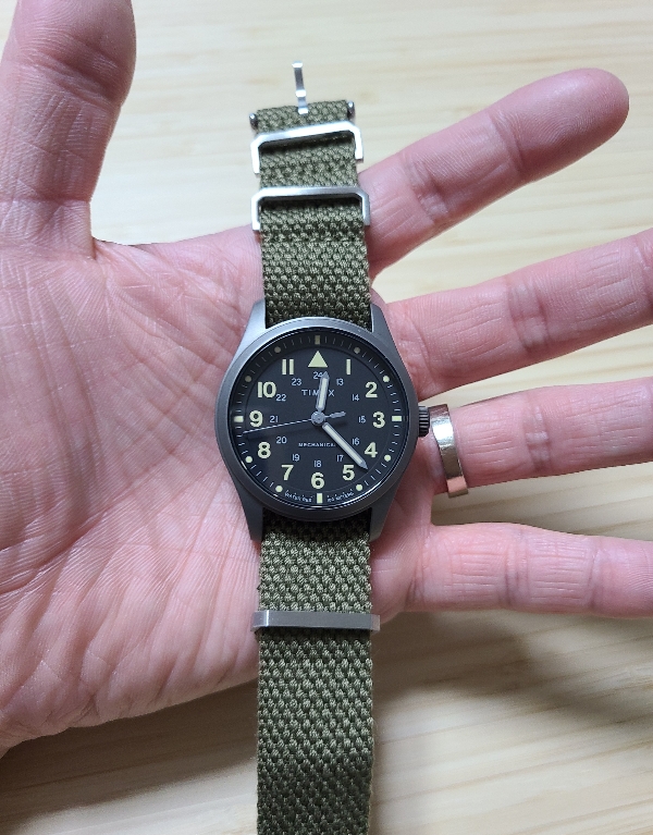바로 타이맥스 익스페디션에 끼워넣어봤습니다. 역시 군인 감성이 느껴지는군요. 개인적으로 저는 나일론 나토 밴드보다는 광택이 없는 이런 캔버스 소재의 나토 스트랩이 더 마음에 듭니다.