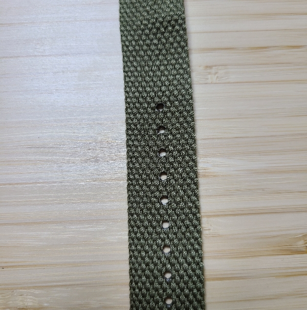 먼저, 알리에서 시계줄을 구입할 때 Army green이라고도 불리는 초록색입니다. 실제로도 군복의 녹색과 비슷한 색입니다. 상품 페이지에 가보시면 버클이 원형인 것과 이렇게 각진 것이 있는데, 저는 이번에 구입한 두 시계줄 모두 각진 버클로 구입했습니다. 버클은 브러시 처리된 스테인리스 스틸 소재라 광택이 적어 강인한 느낌을 줍니다.