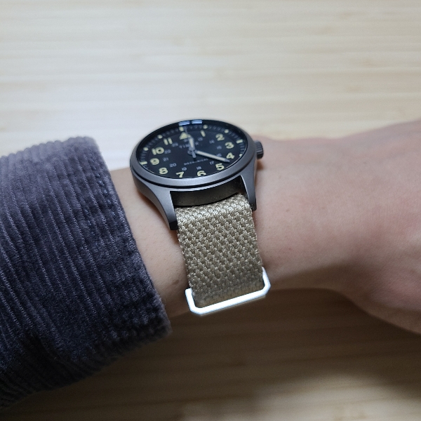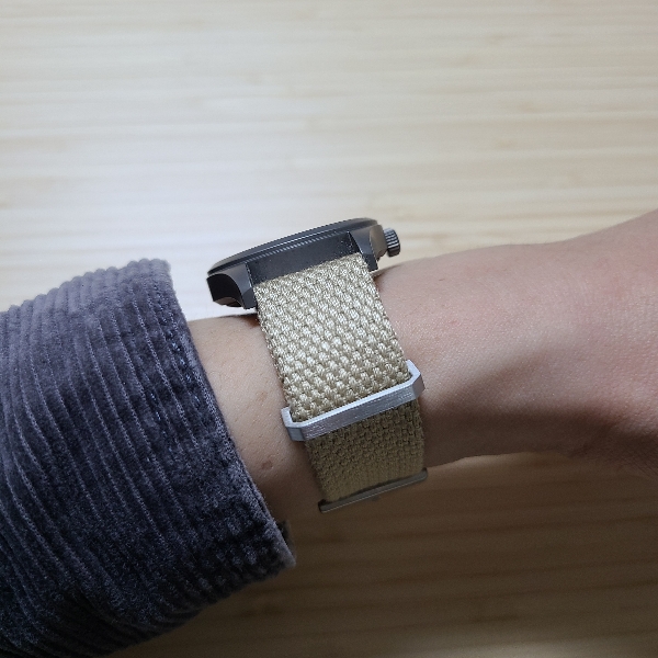 이 시계줄은 나토 스트랩 특유의 벌키한 느낌은 살리면서 편안한 착용감을 제공합니다. 보통 시계줄이 어떤 방식으로든 두꺼워지면 갑갑하고 불편해지기 마련인데, 면(캔버스) 소재를 활용한 덕에 이런 불편이 훨씬 덜해졌습니다.