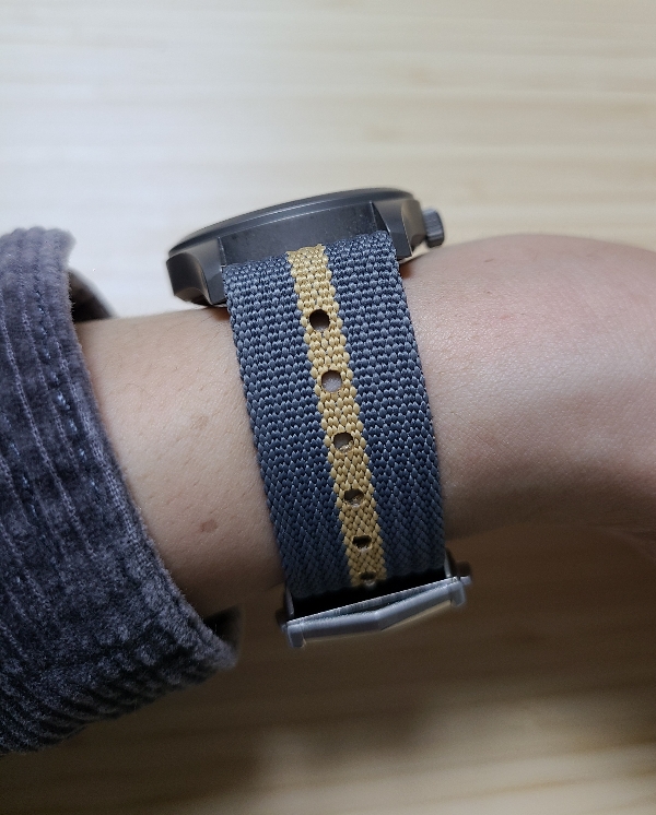 회색 바탕에 카키색으로 포인트가 들어간 나일론 소재의 나토 밴드입니다. 다른 버클 없이 디버클로 착용하는 방식이라, 나토 밴드의 최대 단점인 착용감이 굉장히 개선될 수 있을 것 같다고 예상했습니다.