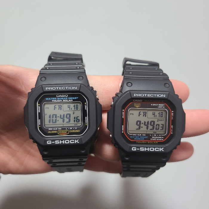 먼저 구입한 G 5600UE를 꺼내서 같이 사진을 찍어봤습니다. G 5600UE는 충전이 되어서 배터리 상태가 H(High)인데 지샥 빨테(GWM 5610)는 이제 막 상자에서 나와서 M(Mid) 상태군요. 빨테는 빨테만의 매력이 있는 것 같고, 왼쪽의 기본모델(G 5600)은 또 나름대로의 깔끔한 매력이 있는 것 같습니다. 알리에서 빨테를 위한 Mod 킷을 주문했는데, 어서 옷을 갈아입혀주고 싶군요!