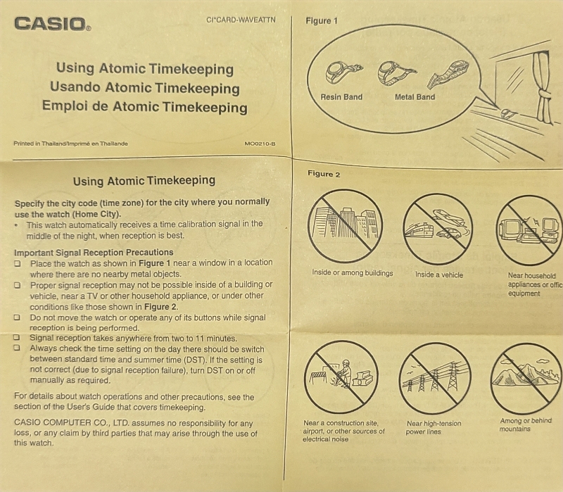 G 5600UE 모델과 마찬가지로 이 GWM 5610 역시 태양광으로 충전할 수 있는 기능이 있고, 거기에 더해 G 5600UE에는 없는 멀티밴드6 기능이 있습니다. 전 세계 6개 지역에 있는 전파탑에서 송신하는 표준시 신호를 자동으로 수신하여 정확한 시간을 늘 유지할 수 있는 기능인데, 일본 후쿠시마와 큐슈, 중국 상해에 전파탑이 위치하고 있어서 우리나라에서도 어지간하면 신호가 잡힙니다. 검색해보니 밤 12시 전후로 신호가 잡힌다고 합니다. 위 사진의 설명은 신호를 잘 받기 위한 여러 조건들을 안내하고 있는데, 일상적인 사용에서는 특별히 신경쓸 것은 없어보입니다. 굳이 창가에 두지 않아도 멀티밴드 신호를 잘 받는 것 같습니다.