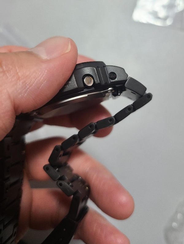 시계줄에는 티타늄 베이스에 카본 코팅이 되어있다고 적혀있습니다. 티타늄의 색이 스테인리스보다는 어두워서 차라리 검은색으로 코팅해둔 것이 더 좋은 선택이었을 것 같습니다. 반짝이는 은빛을 원한다면 무게를 감수하고서라도 스테인리스를 선택하는게 맞는 것 같습니다.