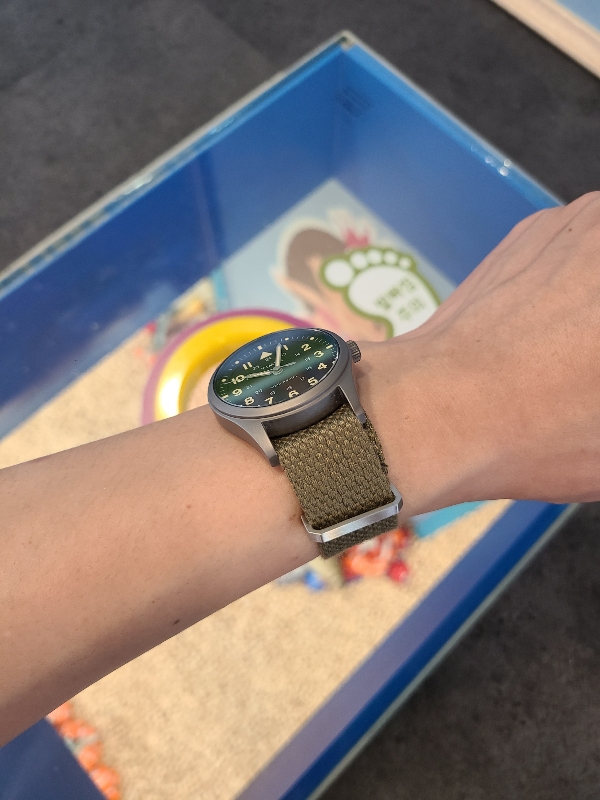 필드워치 디자인이고 전반적으로 광택이 없는 시계이다보니 면 소재의 시계줄과도 잘 어울리는 것 같습니다. 버클 역시 브러시 처리가 된 표면이라 반짝이지 않아서 전체적인 분위기를 깨지 않습니다.