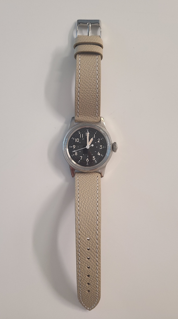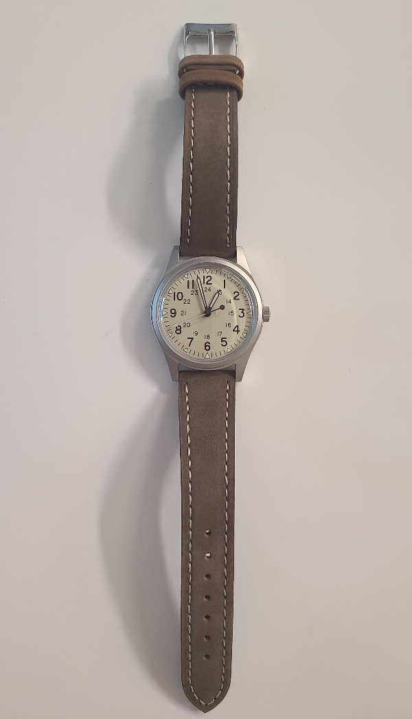 첫 번째 손목시계는 알리발 가성비 필드워치 브랜드인 밀리타도(Militado)의 ML07 크림색 다이얼입니다. 검은색 다이얼 모델도 있지만, 검은색 다이얼의 필드워치가 워낙 여러개 있어서 이 시계는 크림색을 골라봤습니다. 생각보다 색감이 괜찮아서 보관함에 한자리 차지하고 있습니다. 현재 사용중인 시계줄이 너무 어두워보여서 조금 밝은 색으로 바꿔주고 싶었습니다.