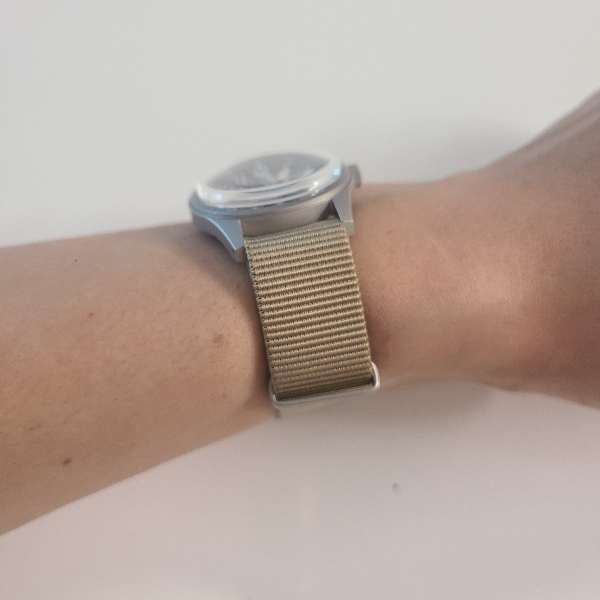 돔형 글라스를 포함하더라도 쿼츠 무브먼트를 사용한 RA03은 굉장히 얇은 손목시계라, 나토 밴드를 체결하더라도 굉장히 편안한 착용감을 제공합니다. 시계가 너무 두꺼우면 무게중심이 높아지면서 손목 위에서 덜렁거리며 불편하게 느껴지는데, RA03은 그렇지 않습니다.