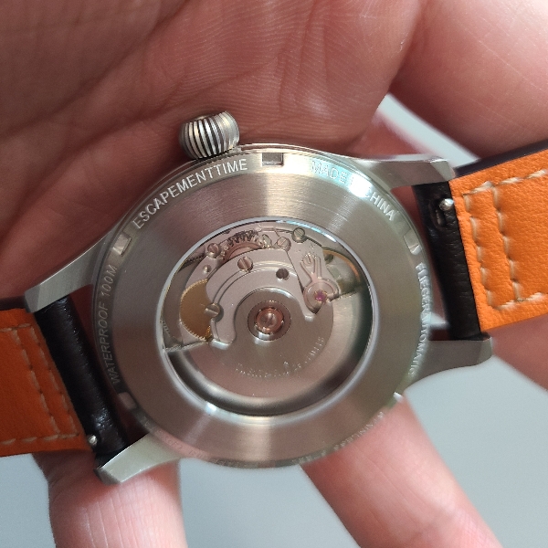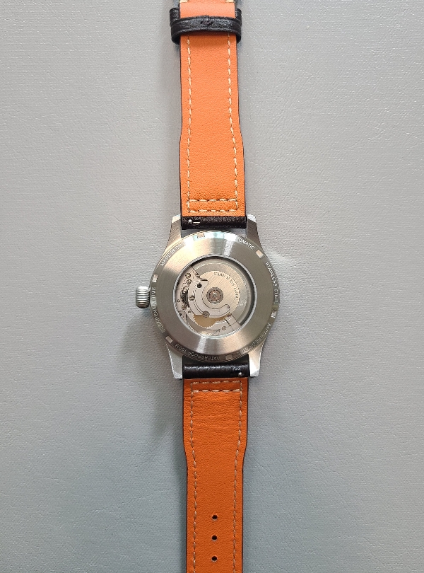 무브먼트를 볼 수 있는 시스루 케이스백이 채택되어 있는데, PT5000 무브먼트를 처음 보지만 그다지 화려하거나 볼거리가 있어보이진 않습니다. 그보다 저 쨍한 주황색의 가죽 안감 처리된 시계줄에 더 눈길이 가는군요.