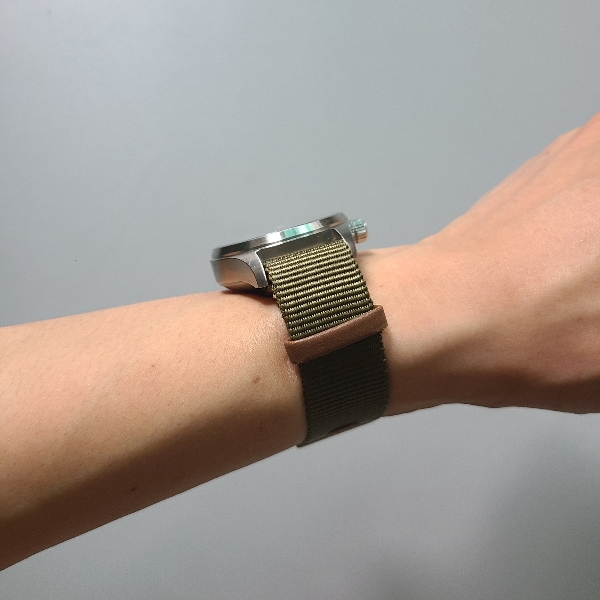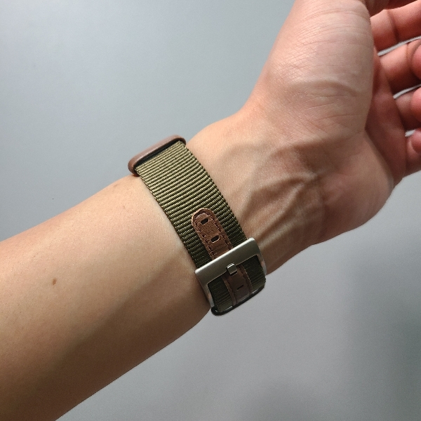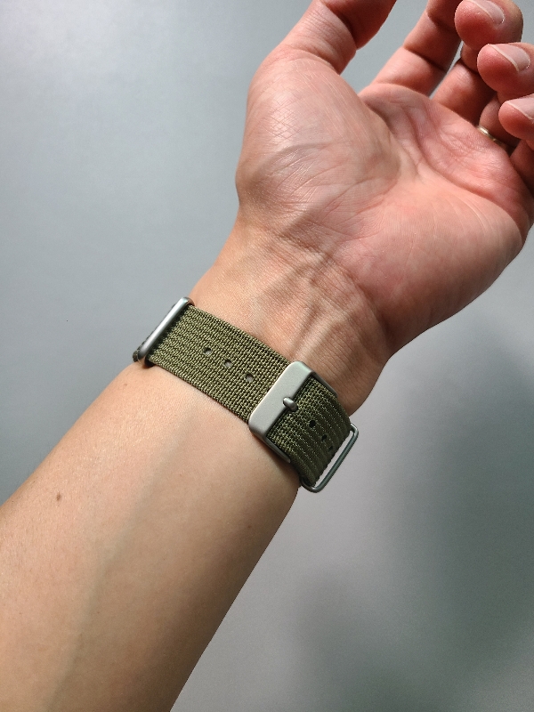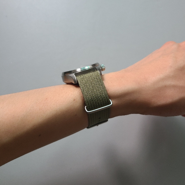 그래서 일반적인 나토 스트랩으로 다시 바꿔봤습니다. 이번에도 비슷한 느낌의 올리브색이고, 나일론 특유의 거친 질감이 느껴지는 나토 밴드입니다. 버클이 너무 얇고 가벼워보이는 밴드는 싸구려 느낌이 강해서, 이 나토 스트랩으로 선택했습니다.