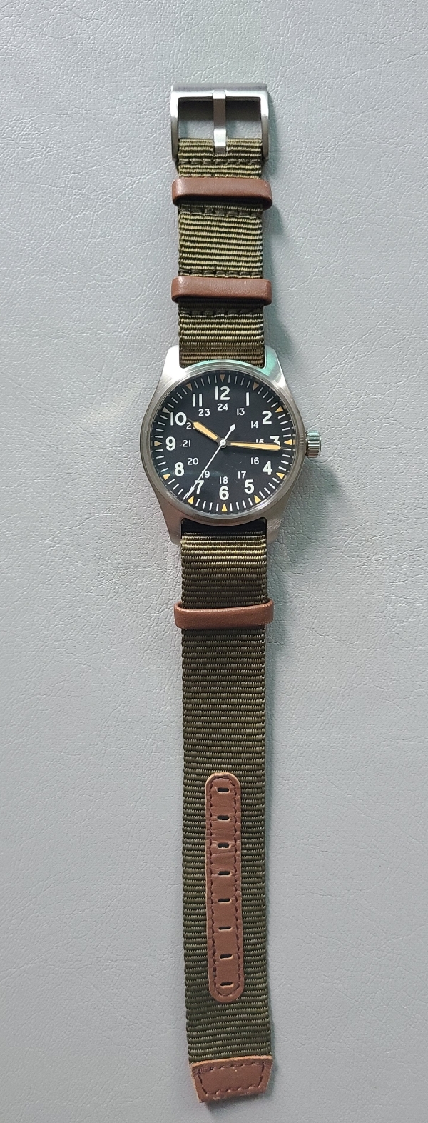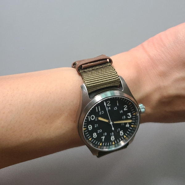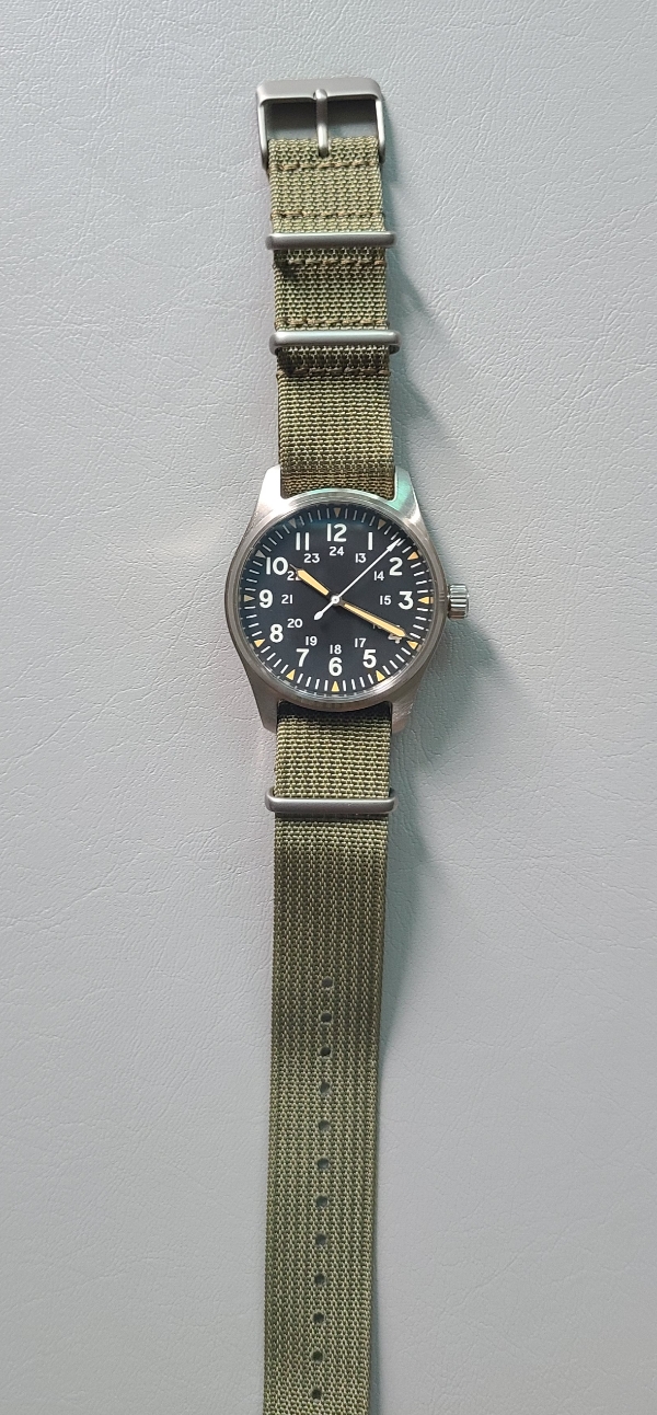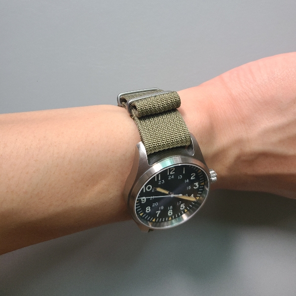 처음 이 시계를 샀을 때 줄질해줬던 해밀턴 스타일의 나일론 나토밴드입니다. 해밀턴 나토 스트랩과 스타일이 비슷해서 탄도리오 카키필드에 조합하면 짝퉁 카키필드가 완성됩니다.