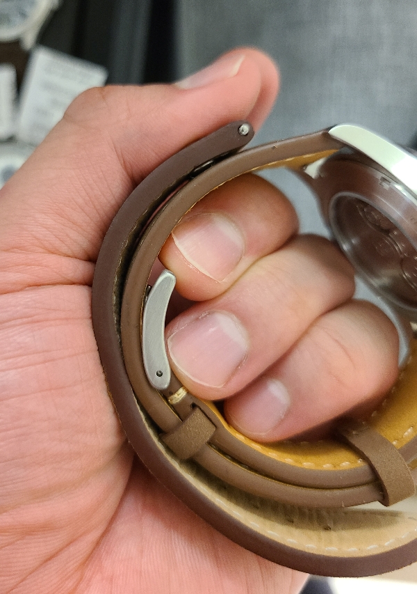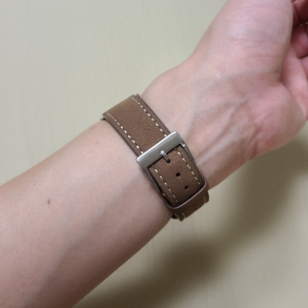 시계줄을 바꿔준 뒤 정면에서 바라보면, 매트한 갈색의 질감과 더 밝은 색으로 처리된 스티치가 만드는 이미지가 기존의 리벳 스트랩과 유사합니다.새 스트랩에 리벳까지 달려있으면 더 좋았겠지만 그건 욕심이니 우선 사용해보려 합니다.