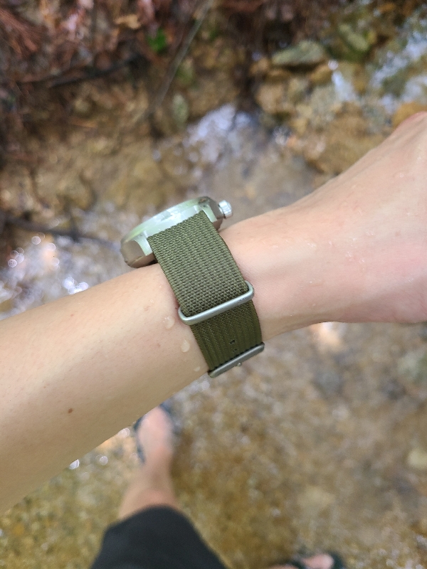 계곡물이 굉장히 시원해서 잠시 물에 들어갔다 나오면 이렇게 시계 유리에 서리가 낍니다. 날짜창이 없는 논데이트 디자인에 사파이어 크리스탈을 사용한 글라스, 농협(NH35) 오토매틱 무브먼트, 200m 방수에 손목에 딱 맞는 사이즈까지, 이 탄도리오 카키필드가 알리발 손목시계 중 가성비가 가장 뛰어난 제품이라 생각합니다.