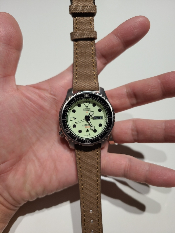 시티즌 복어 특유의 뾰족한 베젤이 캔버스 소재의 거친 느낌과 잘 맞아떨어지는 느낌입니다.