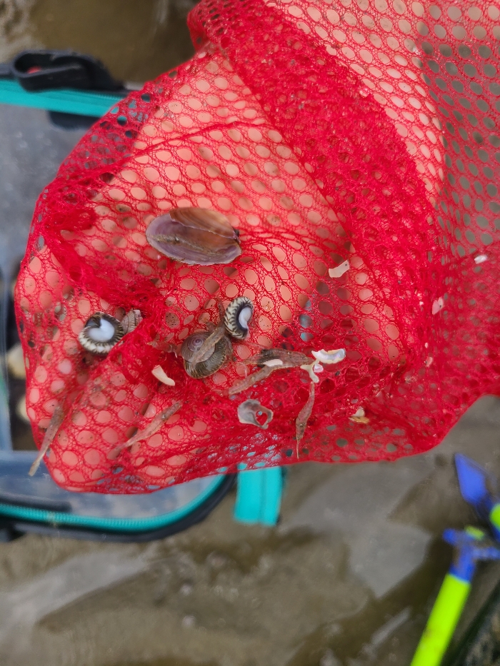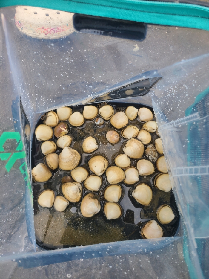 아이가 물고기를 잡는 동안 저는 열심히 조개를 캤습니다. 처음엔 어딜 파내야 할지 몰라서 막막했는데, 사람들이 휘젓고 지나간 자리 근처를 조금 파내보니 금방 조개들이 나오더군요. 조개들이 생각보단 얕게 있어서 갯벌을 조금씩 여러 군데를 파내야겠구나 싶었습니다.