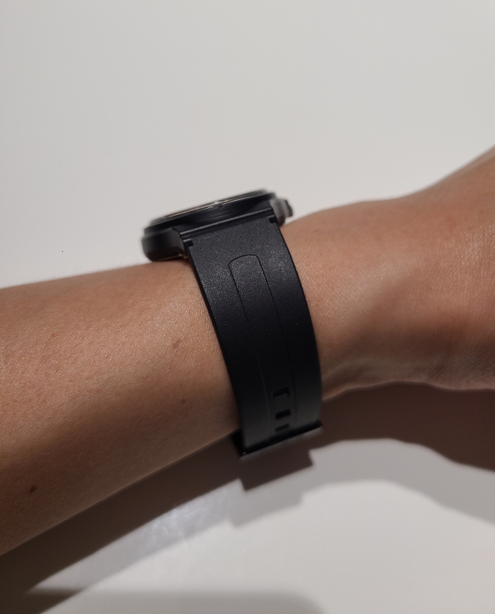 손목 위에 얹었을 때의 느낌입니다. 제 손목 둘레가 17~17.5cm 정도 되는데, 덩치가 그리 크지 않아서인지 이렇게 작은 손목시계를 얹어도 그리 어색하다는 느낌을 받지는 않습니다.