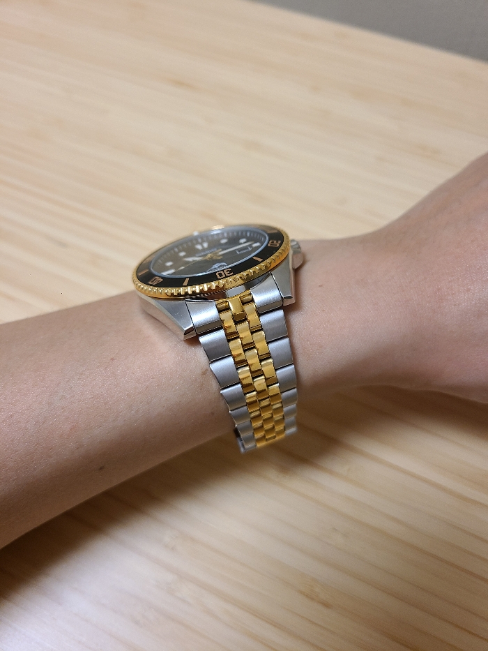 시계줄을 손목에 맞게 줄이고, 착용을 해봤습니다. 뺄 수 있는 링크를 전부 빼고 손목에 올렸는데, 다행히 17-17.5cm 정도의 손목 둘레를 가진 저에게 딱 맞았습니다. 조금만 더 컸더라면 사용을 못할 뻔 했습니다.