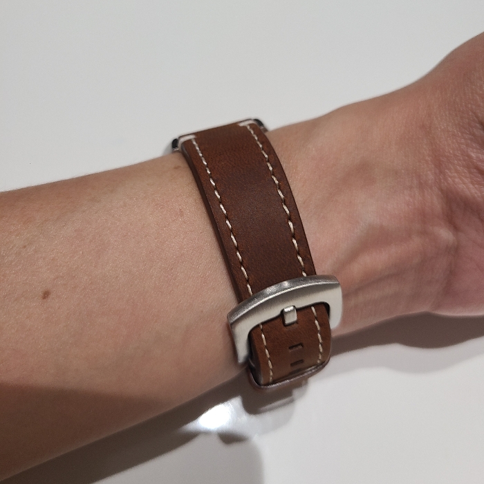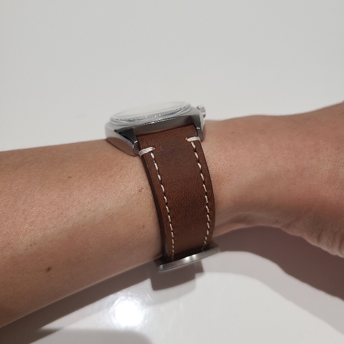 매트한 느낌의 표면을 가지고 있고, 러그부분에 스티치 포인트가 들어가서 캐주얼한 느낌을 줍니다. 또 가죽 색과 스티치의 색이 대비되어 역시 캐주얼한 느낌이 강해집니다. 버클이 굉장히 큰데, 이런 버클이 오히려 작은 알맹이처럼 보일 수 있는 시계를 투박한 도구와 같은 느낌으로 연출하는 데에 도움을 주는 것 같습니다.