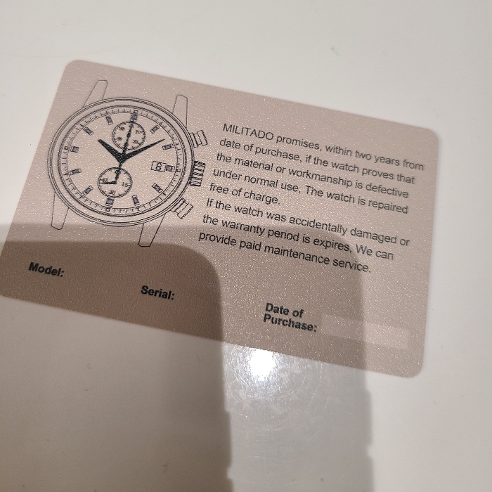 뒷면엔 구매일로부터 2년간 조건부 무상 수리가 가능하다고 적혀있는데, 구매일도 없고 시리얼 넘버도 없어서 제대로 관리가 될 리가 없습니다. 그러니 그냥 버립니다. 만약 고장난 상황인데 이 시계가 너무 마음에 든다면 그냥 새 모델을 구매하는게 정신건강에 이로울 것 같습니다.