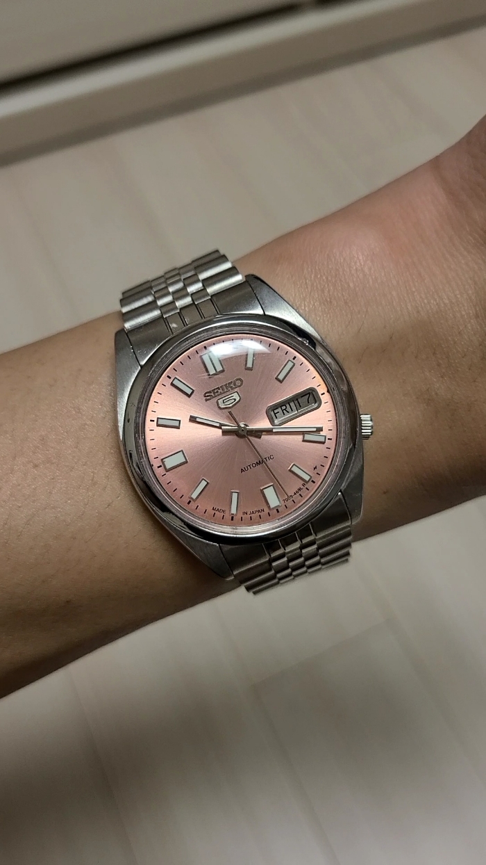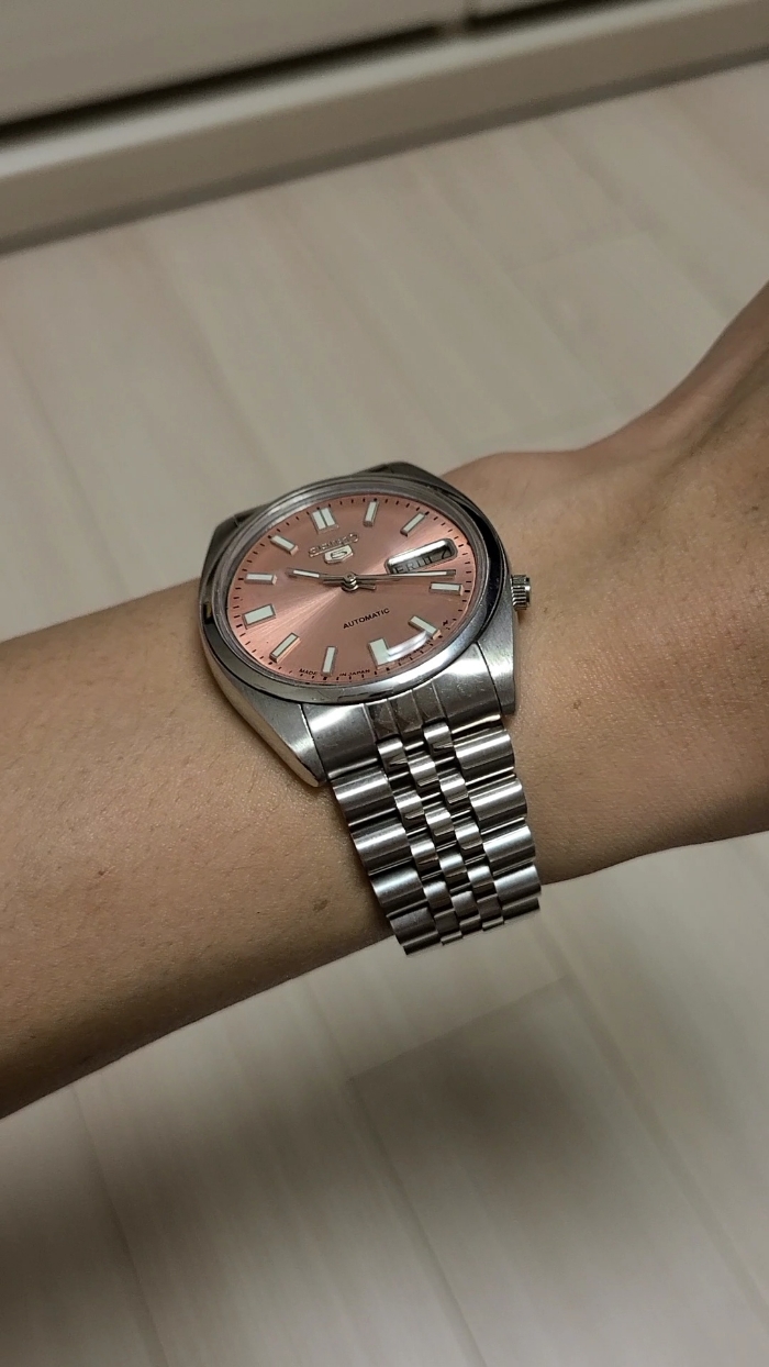 제가 기다리던 연어색 선레이 다이얼을 가진 세이코 5를 손목에 얹어보겠습니다.
