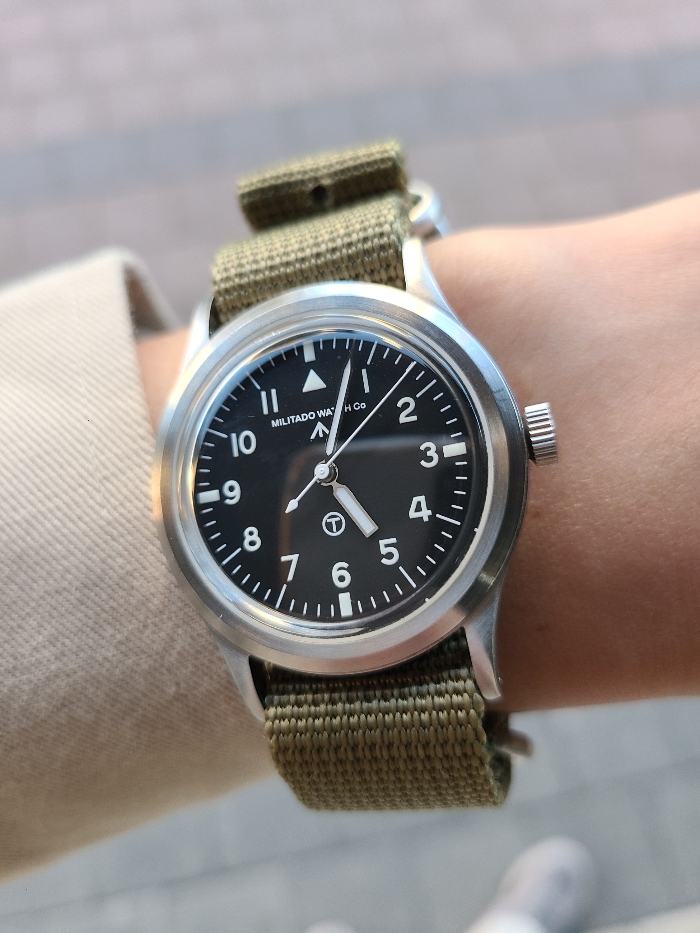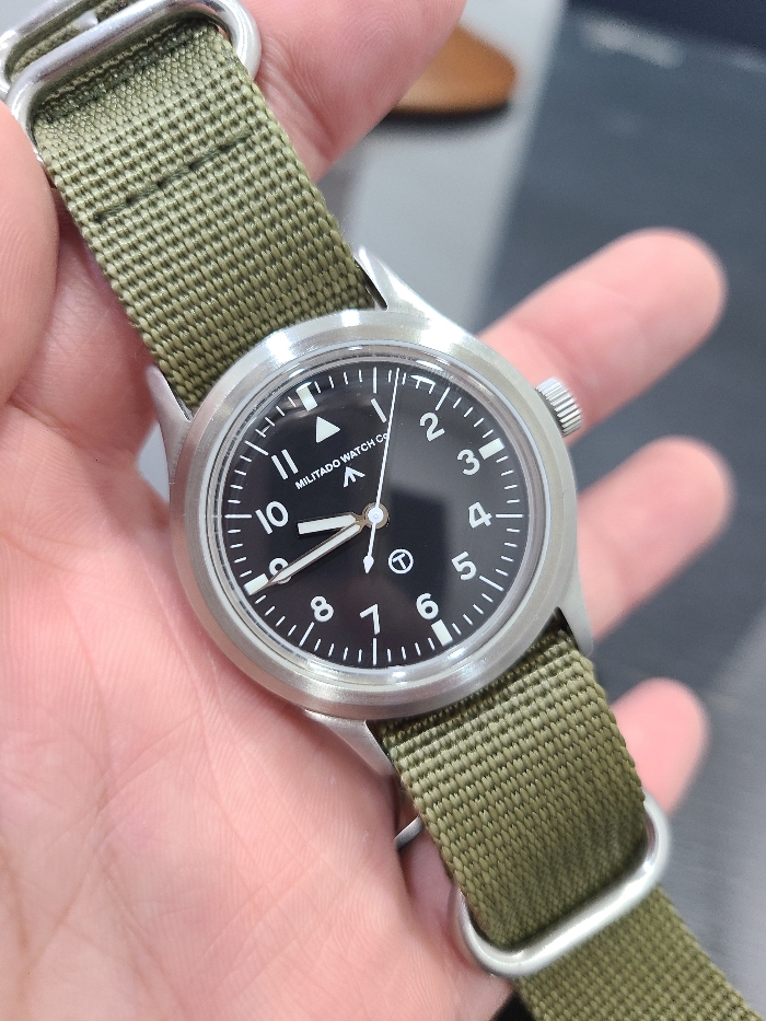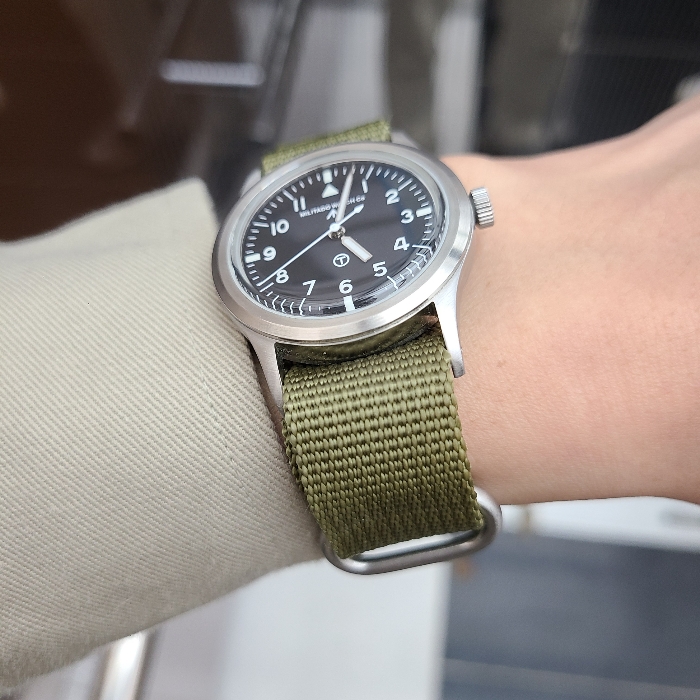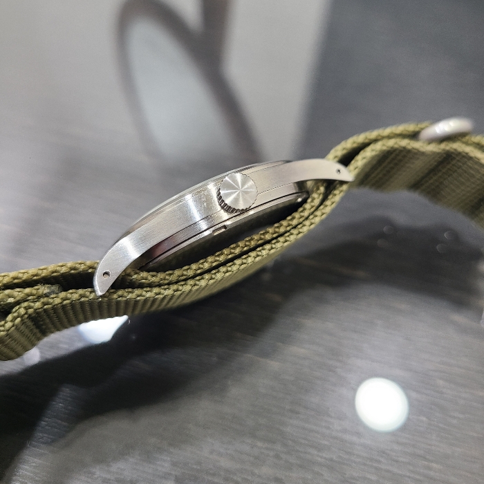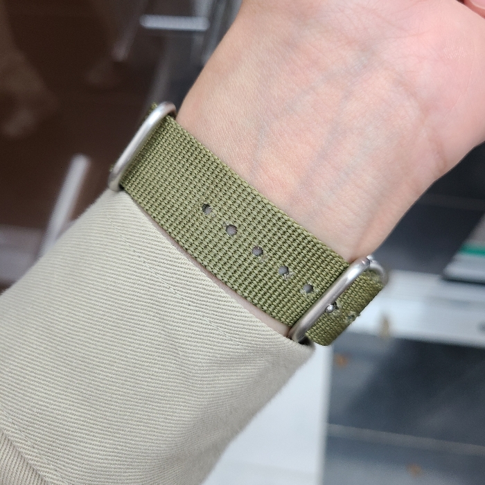 이 올리브색 나토 밴드는 제치 줄인지 아닌지 잘 모르겠습니다만 두툼한게 나쁘지 않군요. 패턴도 단순하지 않아서 이 시계와 잘 어울리는 것 같습니다.
