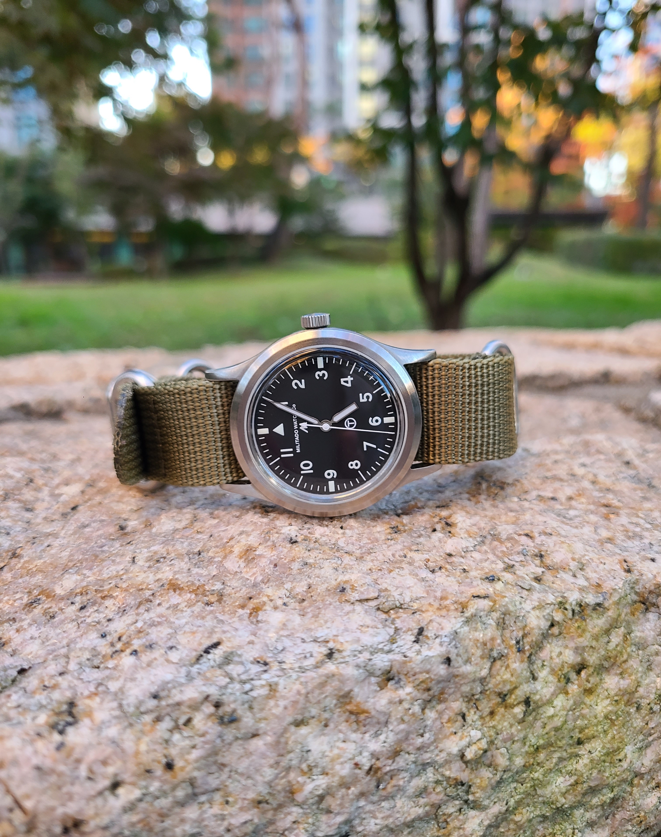 ML14를 자연광 아래에서도 한 샷 찍어봤습니다. Mark 11을 따라한 손목시계들은 알리에서 여럿 본 적이 있지만 대개는 시침이 숫자 인덱스를 가리게되면서 굉장히 보기 싫었고, 그래서 별로 관심이 가지 않던 디자인이었습니다. 그래서인지 더더욱 오마주(혹은 카피)는 이렇게 해야한다는 정답을 보여주는 것 같습니다.