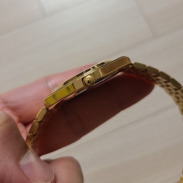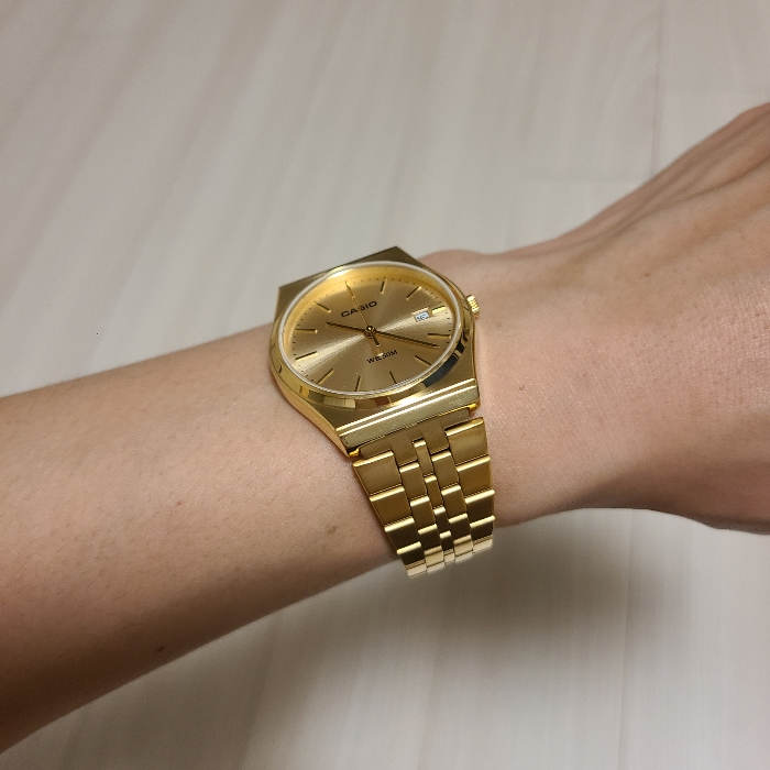 비닐을 벗겨내니 금빛의 선레이 다이얼이 제일 먼저 눈에 들어옵니다. 그 위로 정갈하게 붙여놓은 금빛 인덱스들과 통일감있는 금빛 핸즈까지, 반짝이는 요소들을 굉장히 많이 사용했습니다. 케이스 전면부는 브러시 처리가 되어 있는데, 이 부분까지 만약 폴리시 처리가 되어 번쩍였다면 너무 과했을 것 같다는 느낌이 듭니다. 역시 카시오가 영리하게 디자인했다고 생각합니다.