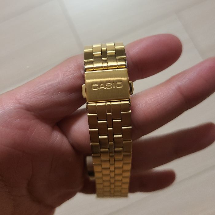 버클에도 카시오를 음각으로 새겨놓았습니다. 전체적인 금빛 톤을 해치지 않은 모습입니다.