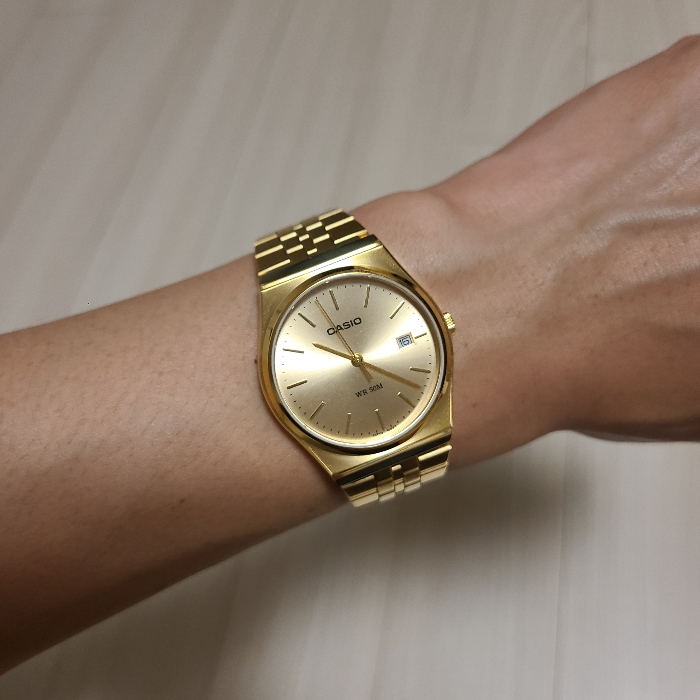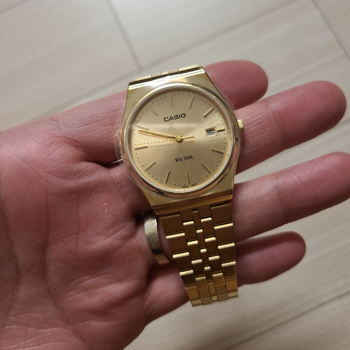 오늘은 멀리서 봐도 반짝이는 금장 시계, 카시오의 일체형 브레이슬릿 손목시계인 MTP-B145G-9A를 가져왔습니다.