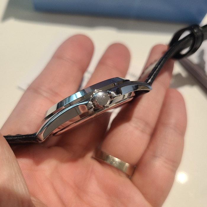 스트랩을 교체하며 옆면을 살펴봤습니다. 안그래도 10mm 미만의 얇은 두께인데 미드케이스까지 얇게 빠져서 더욱 슬림해보이는 디자인입니다. 미드케이스의 중앙부에 맞게 용두가 위치하고 있는데, 이런 디테일을 5만원대 손목시계에서 볼 수 있다니.. 볼 수록 놀랍습니다.